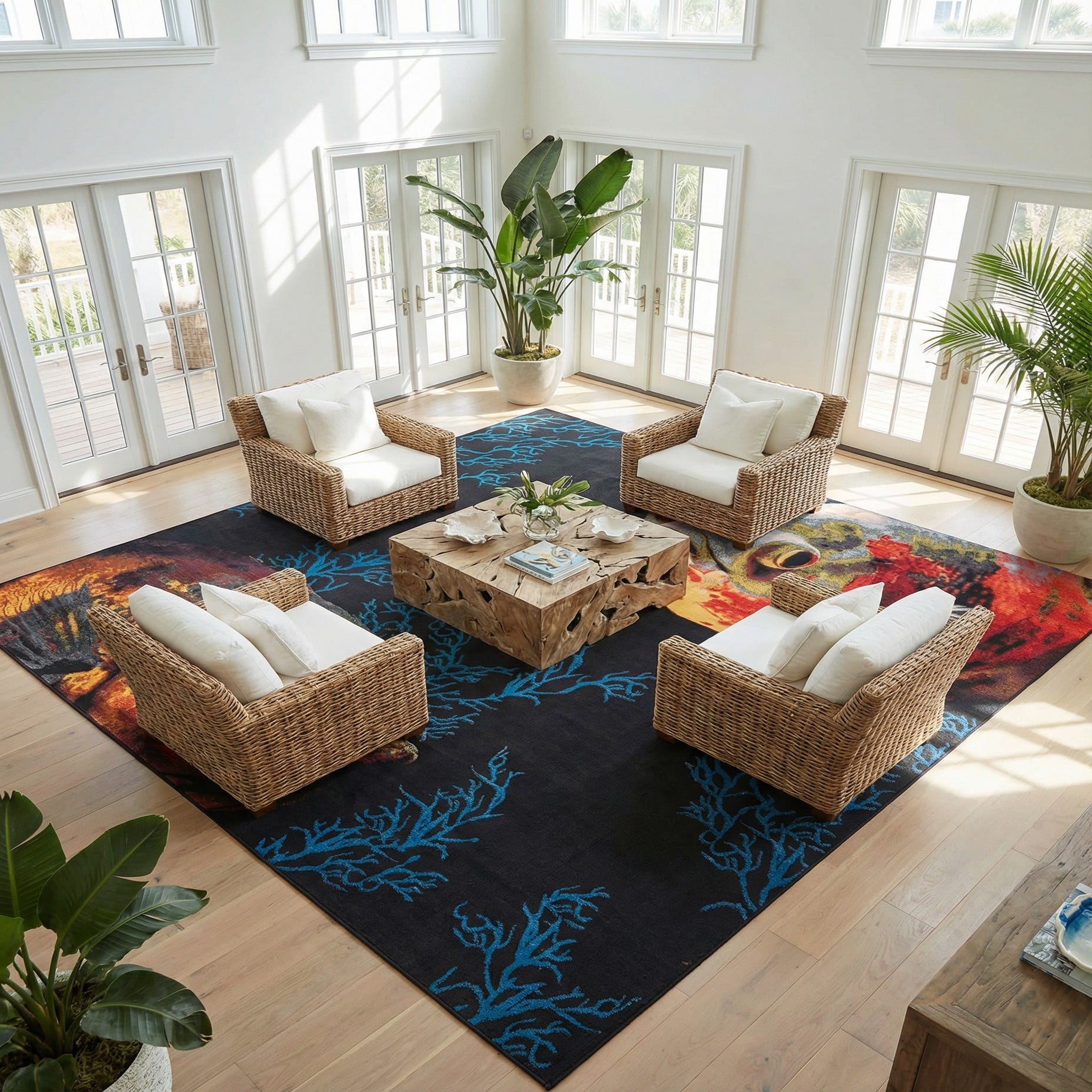 This Outdoor Coastal Collection rug brings a touch of marine life to any setting. The design showcases a dynamic depiction of fish with a contrast of warm and cool colors, creating an underwater seascape on your floor. The palette includes multi-tone hues of black, blue, brown, red, gold, olive, navy blue, and yellow set against a varied multi-colored background, which allows for versatile placement in multiple outdoor settings or interiors looking for a coastal ambiance.