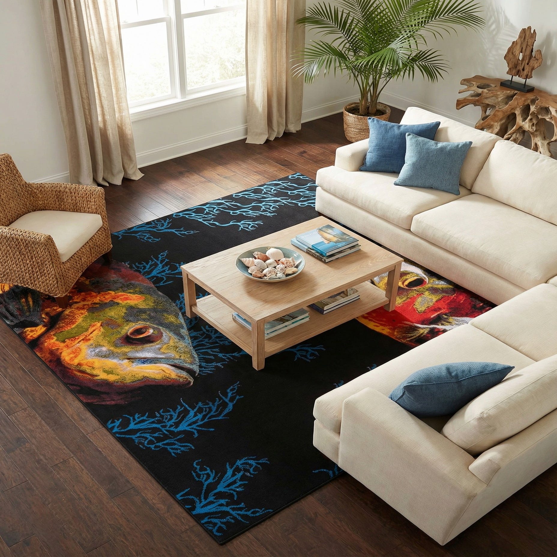 A square multi-colored rug featuring two vibrant fish, one red and one orange, on a black background with blue coral patterns, perfect for a patio.