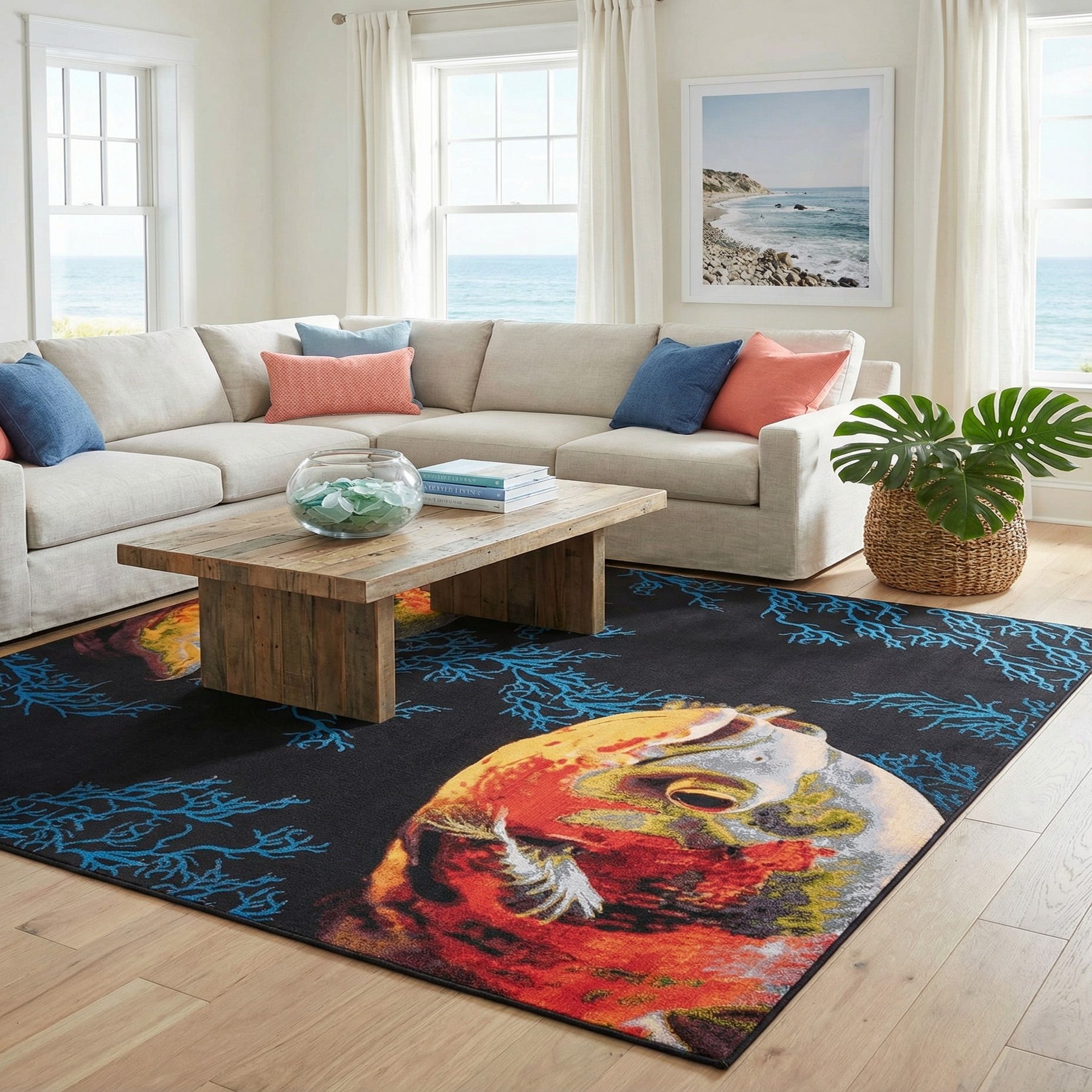 This Outdoor Coastal Collection rug brings a touch of marine life to any setting. The design showcases a dynamic depiction of fish with a contrast of warm and cool colors, creating an underwater seascape on your floor. The palette includes multi-tone hues of black, blue, brown, red, gold, olive, navy blue, and yellow set against a varied multi-colored background, which allows for versatile placement in multiple outdoor settings or interiors looking for a coastal ambiance.