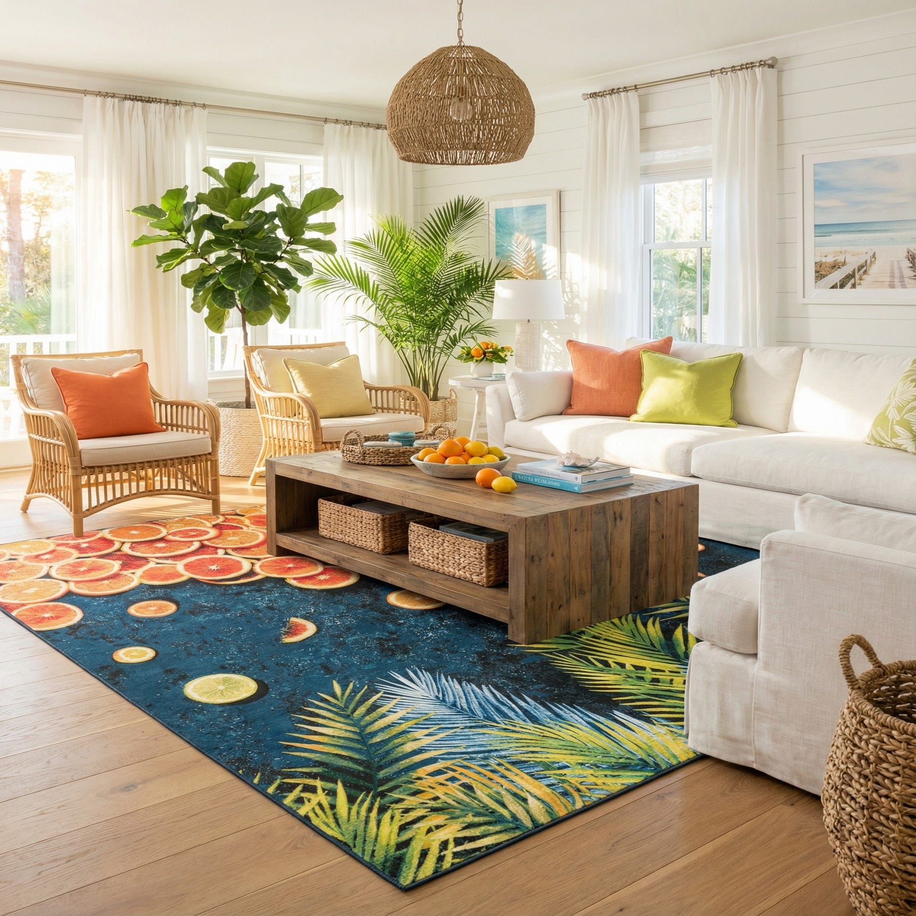The rug displays a lively pattern featuring an array of citrus slices at the base transitioning into tropical palm fronds towards the top, set against a multi-colored background that enhances the vibrancy of the design. The color palette includes a range of hues such as black, green, ivory, olive, orange, red, yellow, blue, and navy blue, lending both warmth and boldness to the overall aesthetic.