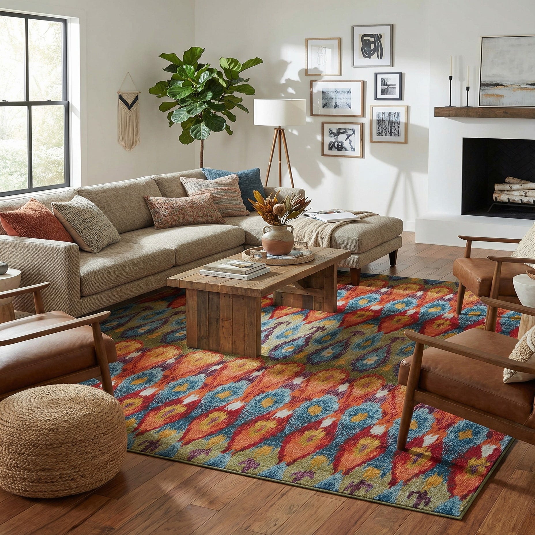 This lively palette and pattern work well on a covered patio or sunroom, or inside a casual living or dining area where color and pattern can be the focal point. Pair it with warm wood furniture, leather or neutral wicker for a grounded look, or layer it into a modern space with solid-colored upholstery and brass or woven accents for a global, collected vibe.