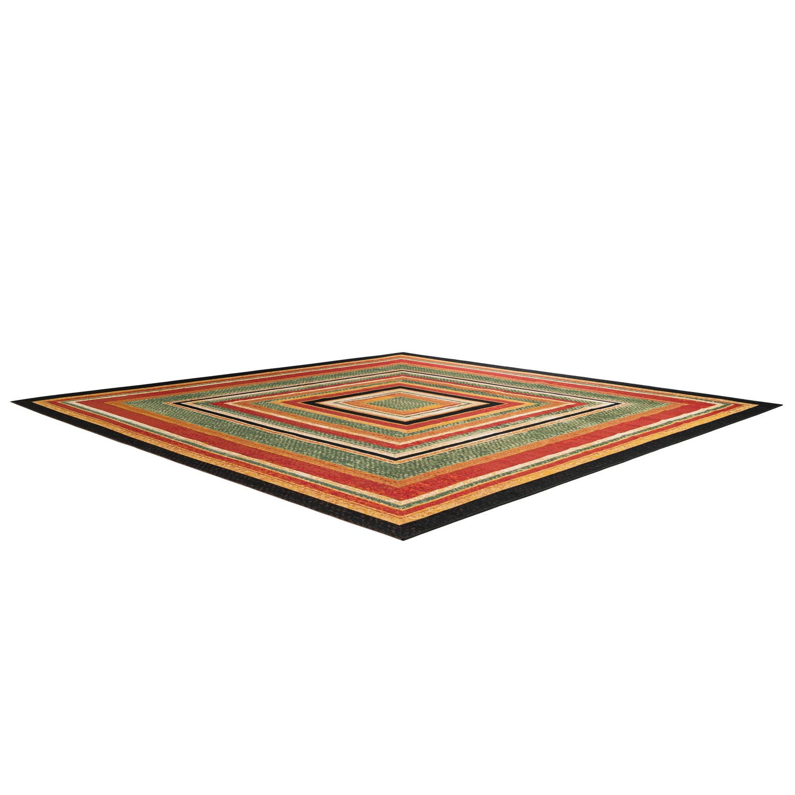 A 10' square multi-colored modern rug with concentric squares in shades of green, orange, red, and black.
