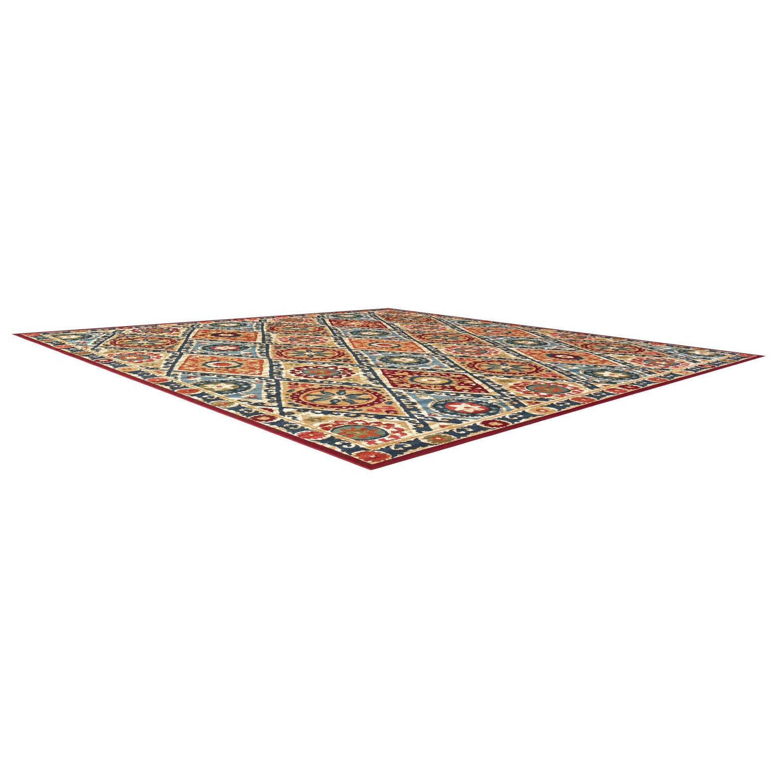 A multi-colored square rug with an intricate modern oriental pattern, featuring diamonds and floral medallions in shades of blue, red, orange, and gold, suitable for a patio.