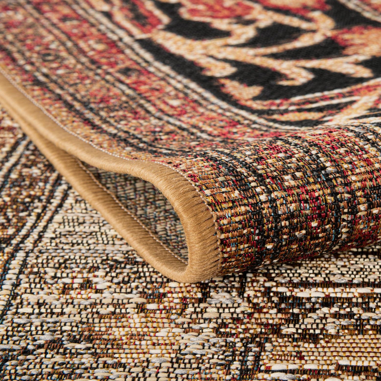 Machine-made, 100% polypropylene construction makes this piece resilient and well suited for both covered outdoor spaces and high-traffic interiors. Place it beneath a dining table to ground a warm wood setting, layer it in a living room with leather or upholstered seating and brass accents, or use it on a covered porch paired with neutral cushions for an inviting transition between indoors and out. Its traditional pattern and balanced color palette work well with classic, transitional, or eclectic decor schemes.