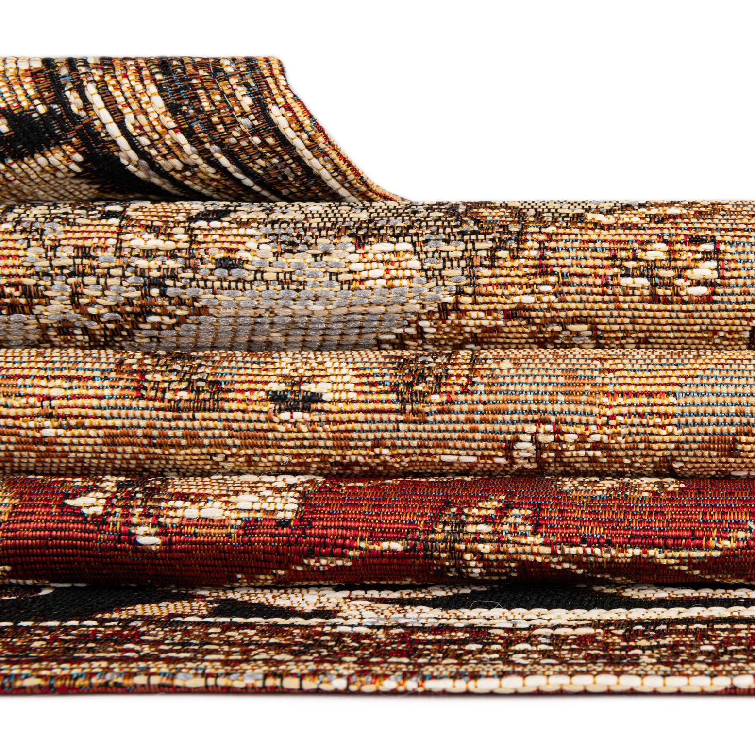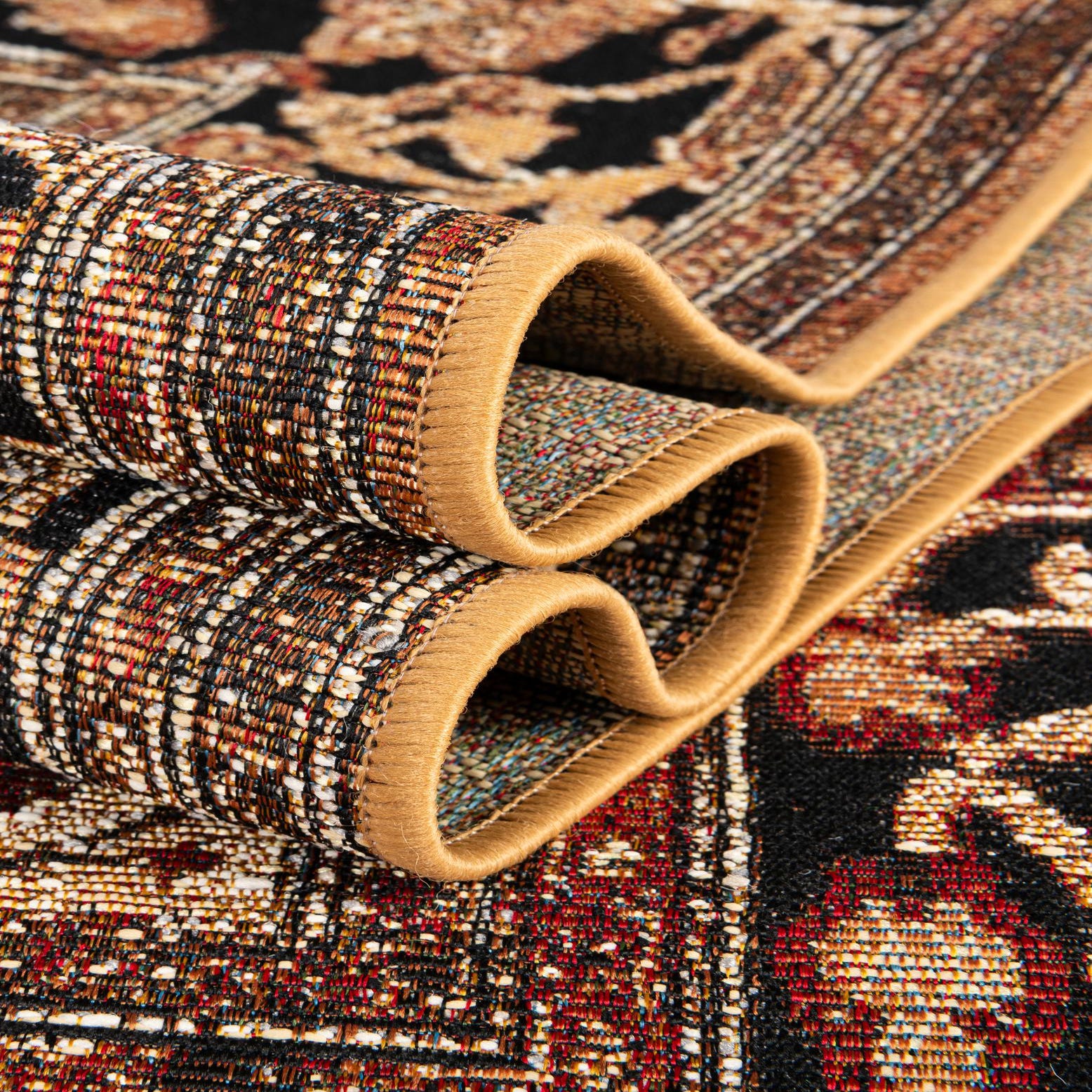 Machine-made, 100% polypropylene construction makes this piece resilient and well suited for both covered outdoor spaces and high-traffic interiors. Place it beneath a dining table to ground a warm wood setting, layer it in a living room with leather or upholstered seating and brass accents, or use it on a covered porch paired with neutral cushions for an inviting transition between indoors and out. Its traditional pattern and balanced color palette work well with classic, transitional, or eclectic decor schemes.