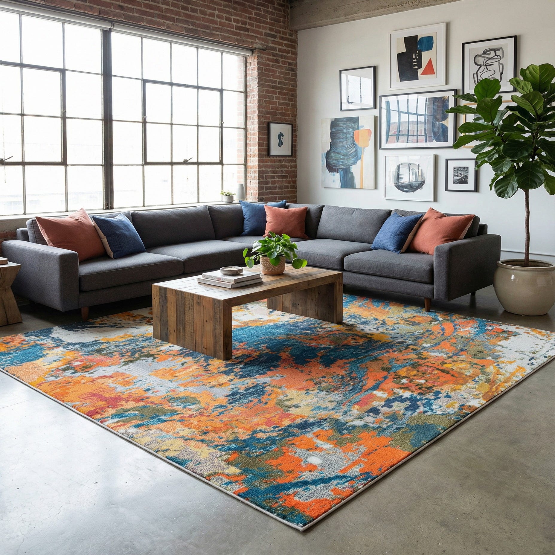 Underfoot the rug has a low, dense pile with a smooth, slightly velvety touch typical of polypropylene construction. The weave delivers a consistent texture that shows the color variations clearly and offers a comfortable base for everyday living. This rug pairs well with mid-century and modern furnishings, anchoring a living room with a neutral sofa and navy or brass accents, adding contrast beneath a wood dining table, or bringing creative energy to a home office or studio. It also layers nicely over natural fiber rugs to introduce color and visual depth.