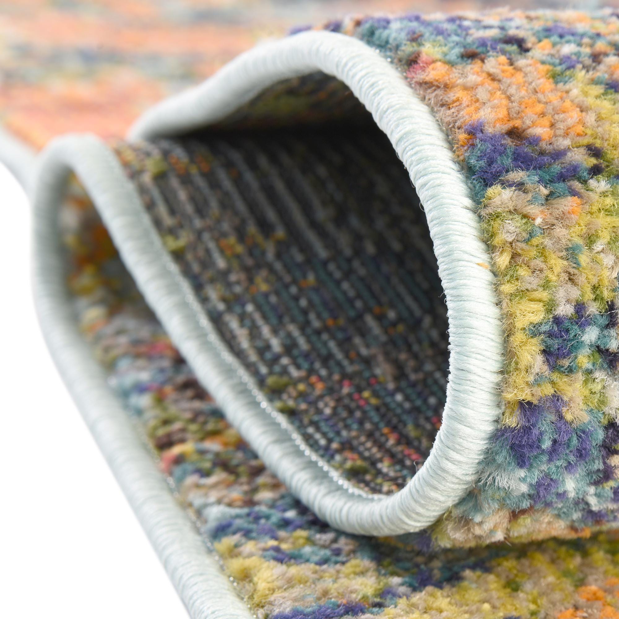 Underfoot the rug has a low, dense pile with a smooth, slightly velvety touch typical of polypropylene construction. The weave delivers a consistent texture that shows the color variations clearly and offers a comfortable base for everyday living. This rug pairs well with mid-century and modern furnishings, anchoring a living room with a neutral sofa and navy or brass accents, adding contrast beneath a wood dining table, or bringing creative energy to a home office or studio. It also layers nicely over natural fiber rugs to introduce color and visual depth.