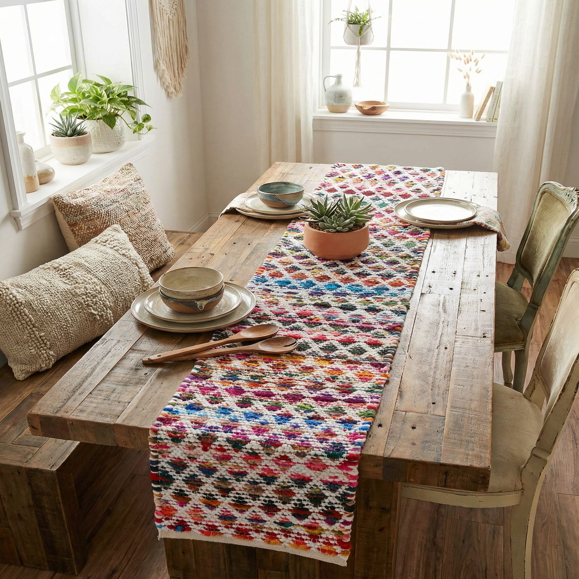 This runner works well on a long dining table to add color and visual interest without overwhelming other tabletop elements, or laid along a buffet or console to enliven an entry or hallway. It pairs naturally with rustic or coastal farmhouse settings, bohemian and eclectic interiors that embrace mixed color and texture, and contemporary casual rooms needing a pop of layered pattern. The varied palette makes it easy to coordinate with wood tones, neutral linens, and metal accents.