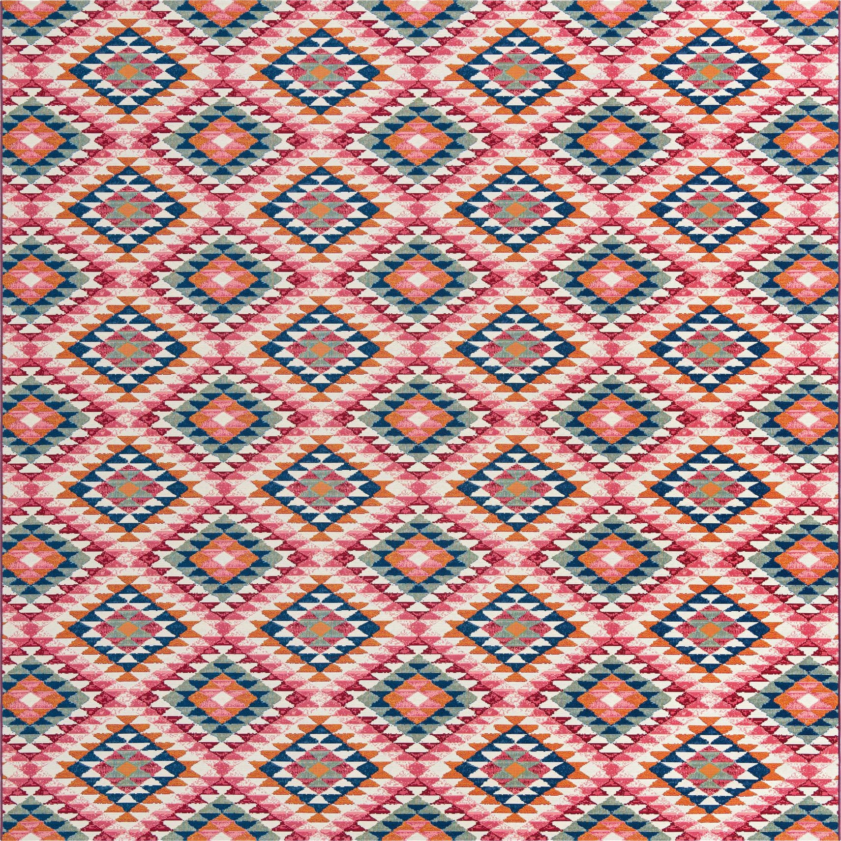 A repeating, stepped-diamond motif gives this rug a lively Southwestern look, with concentric geometric shapes formed from small triangles and chevrons. The multi-tone background anchors the pattern while bands of ivory, navy blue, gold, red, pink and green create layered contrast and visual depth. The overall effect is structured and rhythmic, with each diamond framed by textured color transitions that add movement to the surface.