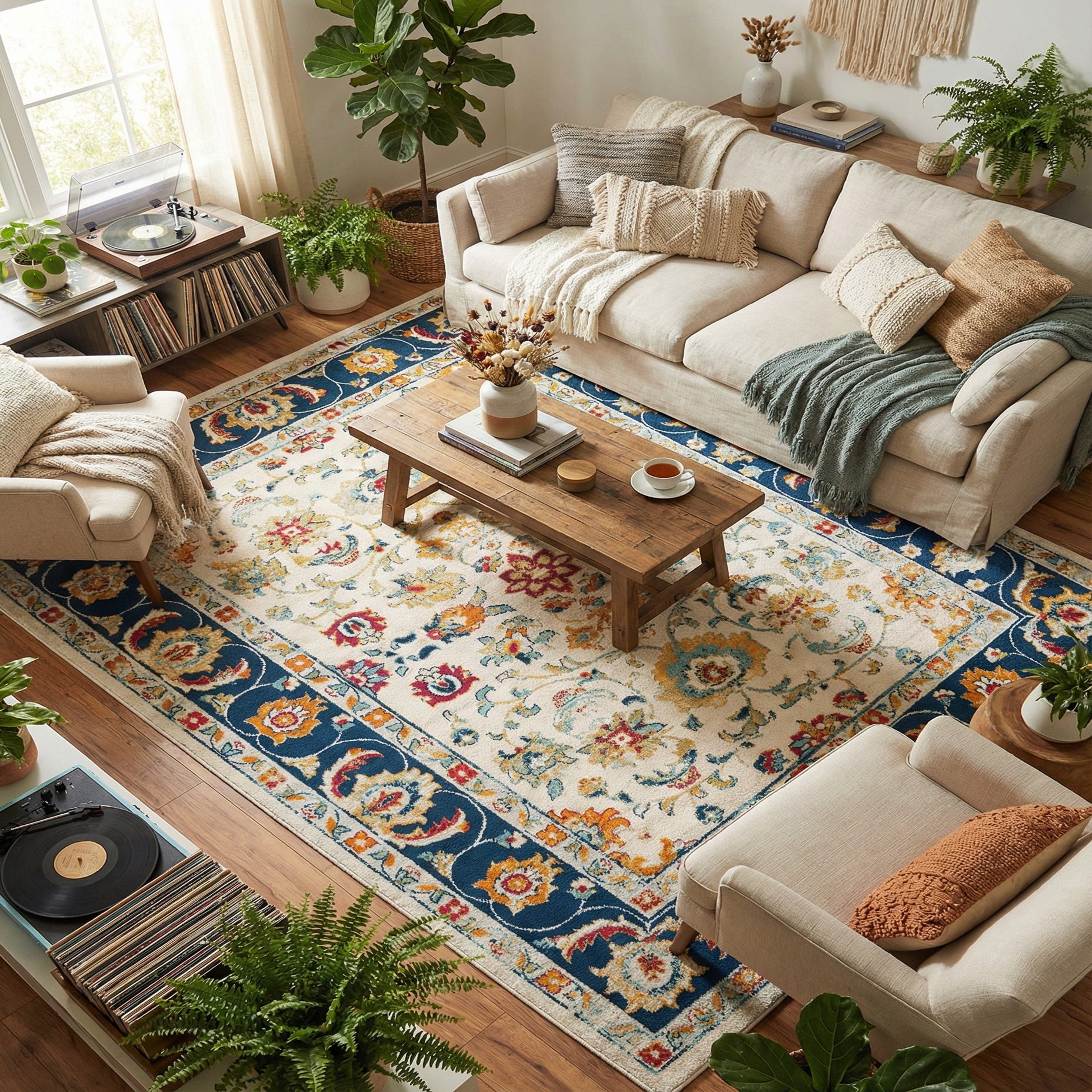 This rug works well in a large living room or formal dining area where the patterned field can be showcased, and it pairs nicely with warm wood furnishings, navy or neutral upholstery, and brass or matte black accents. It also complements transitional, farmhouse and eclectic interiors—layer it under a dining table to ground the space or place it in a seating arrangement to introduce color and pattern without overwhelming the room.