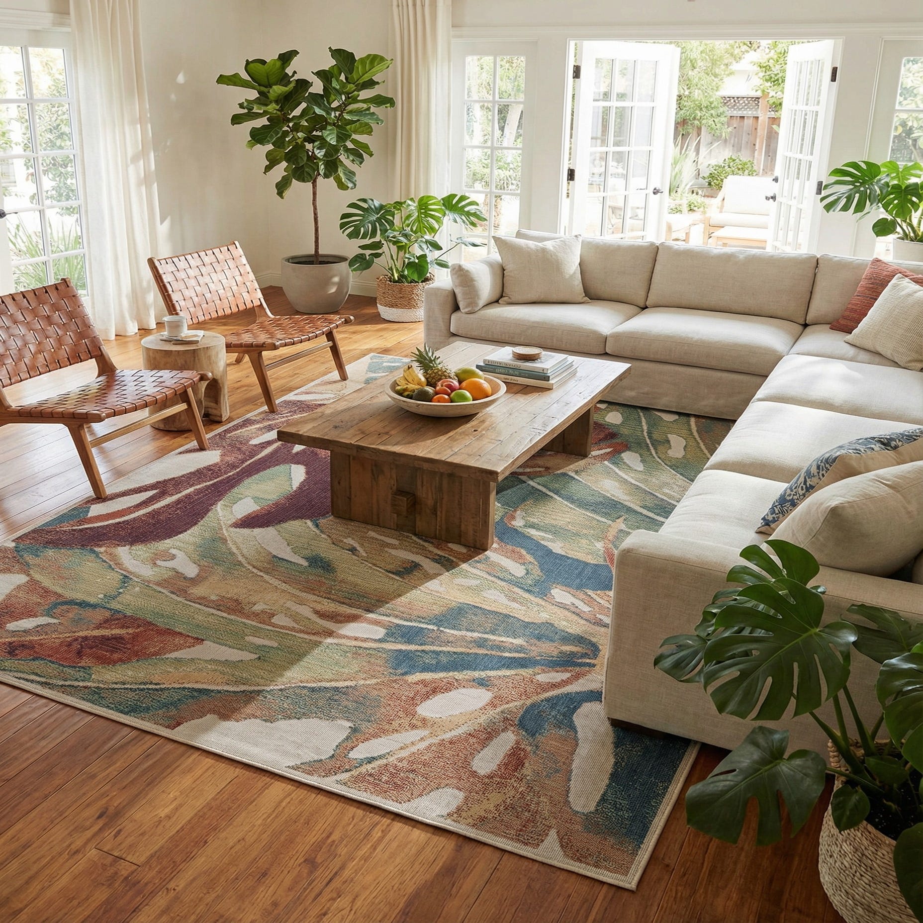 A large-scale botanical motif sprawls across a multi ground, its broad, painterly leaves layered in beige, blue, navy, brown, rust red and orange. The pattern is contemporary with a relaxed, coastal influence — organic shapes and soft color transitions create movement without strict symmetry. Machine-made from 100% polypropylene, the rug has a low-profile, tightly woven face that feels firm yet slightly textured underfoot, giving a woven, outdoor-friendly hand that works well on covered porches, patios or high-traffic indoor spaces.