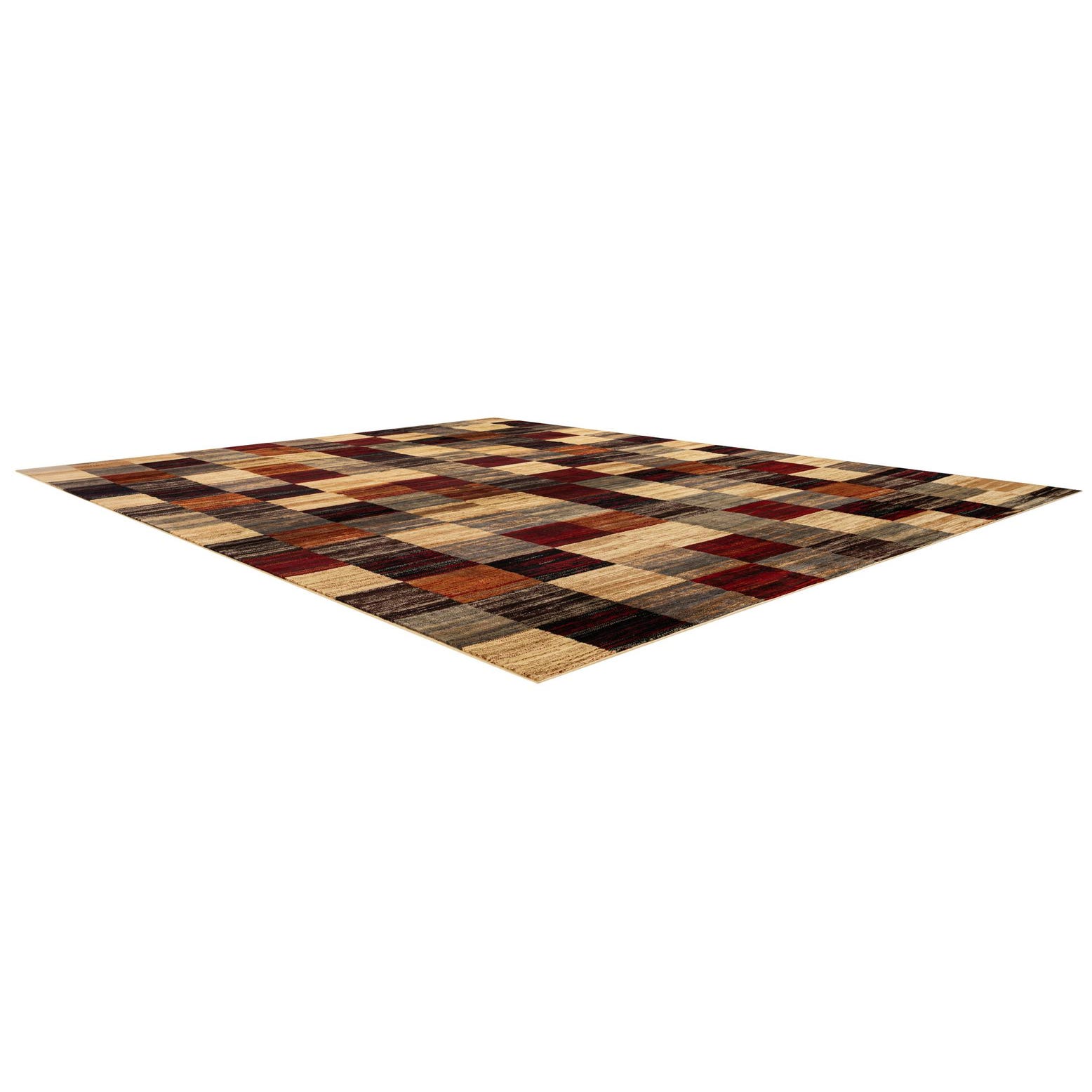A rhythmic patchwork of stacked rectangular blocks gives this rug a structured, modern look with a warm, lived-in appeal. The background reads as multi, with bands of beige, burgundy, brown, gray, blue and black running through each block in subtle, horizontal striations that add visual texture and depth. Made from 100% polypropylene with a low pile, the surface feels smooth and slightly cushioned underfoot while the varied striations and color shifts create a tactile impression you can both see and feel.