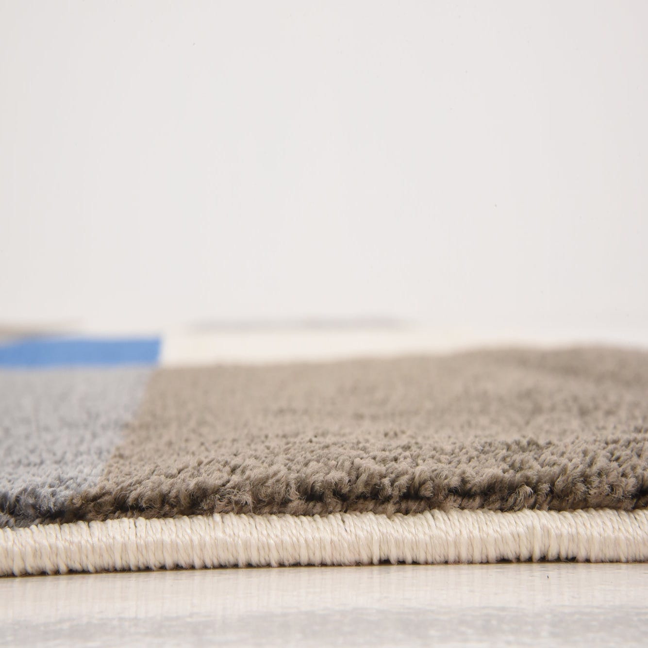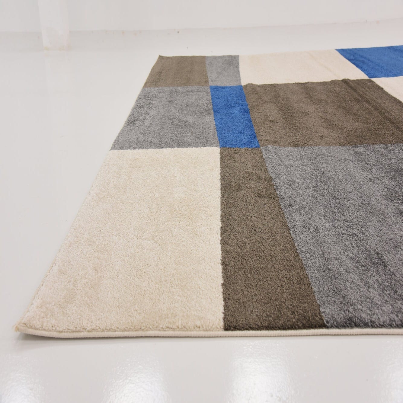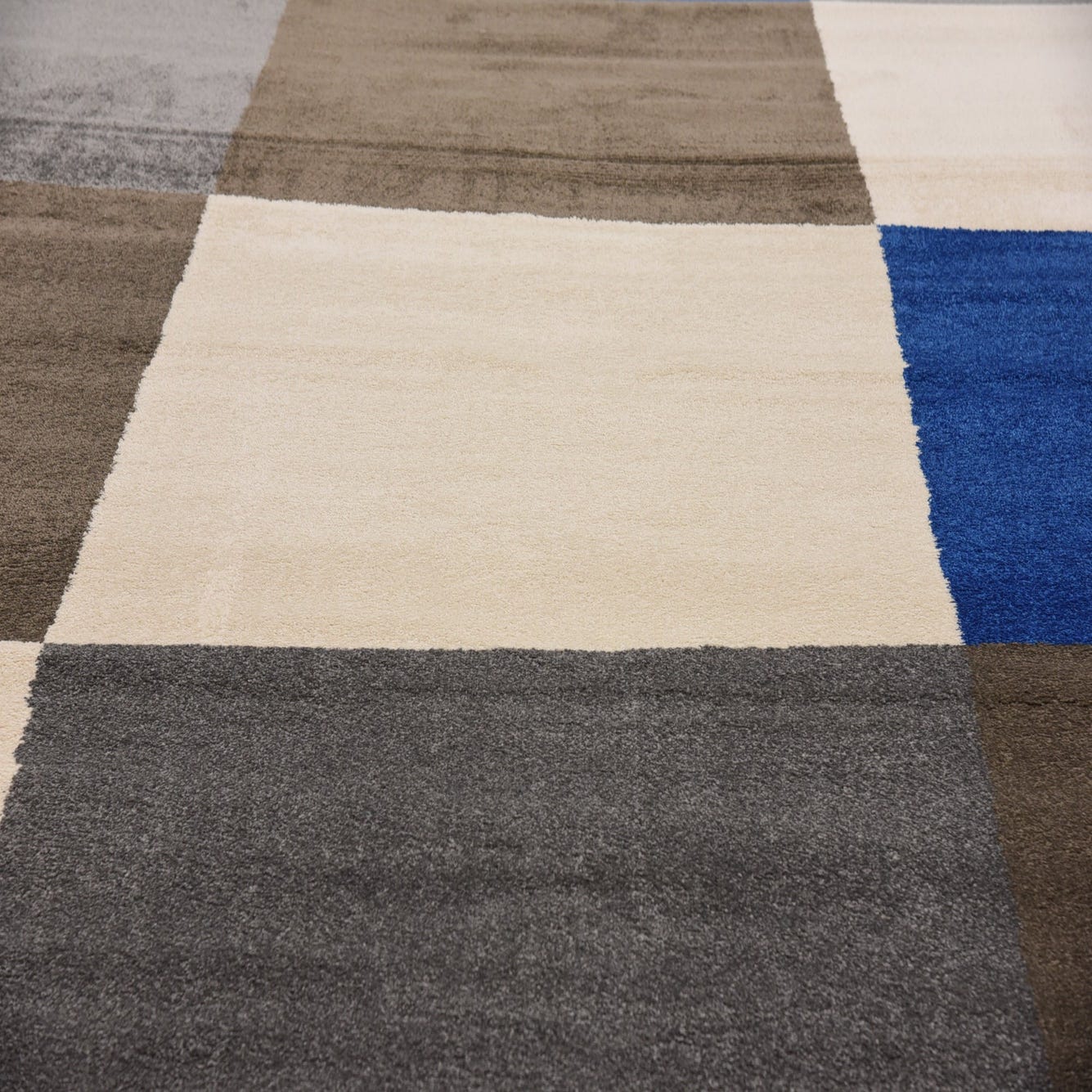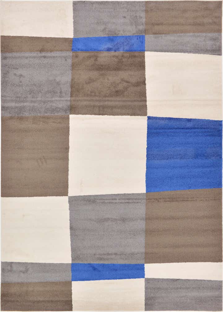 A 10x13 rectangular Frieze rug with a modern multi-colored geometric pattern in blue, brown, gray, and cream.