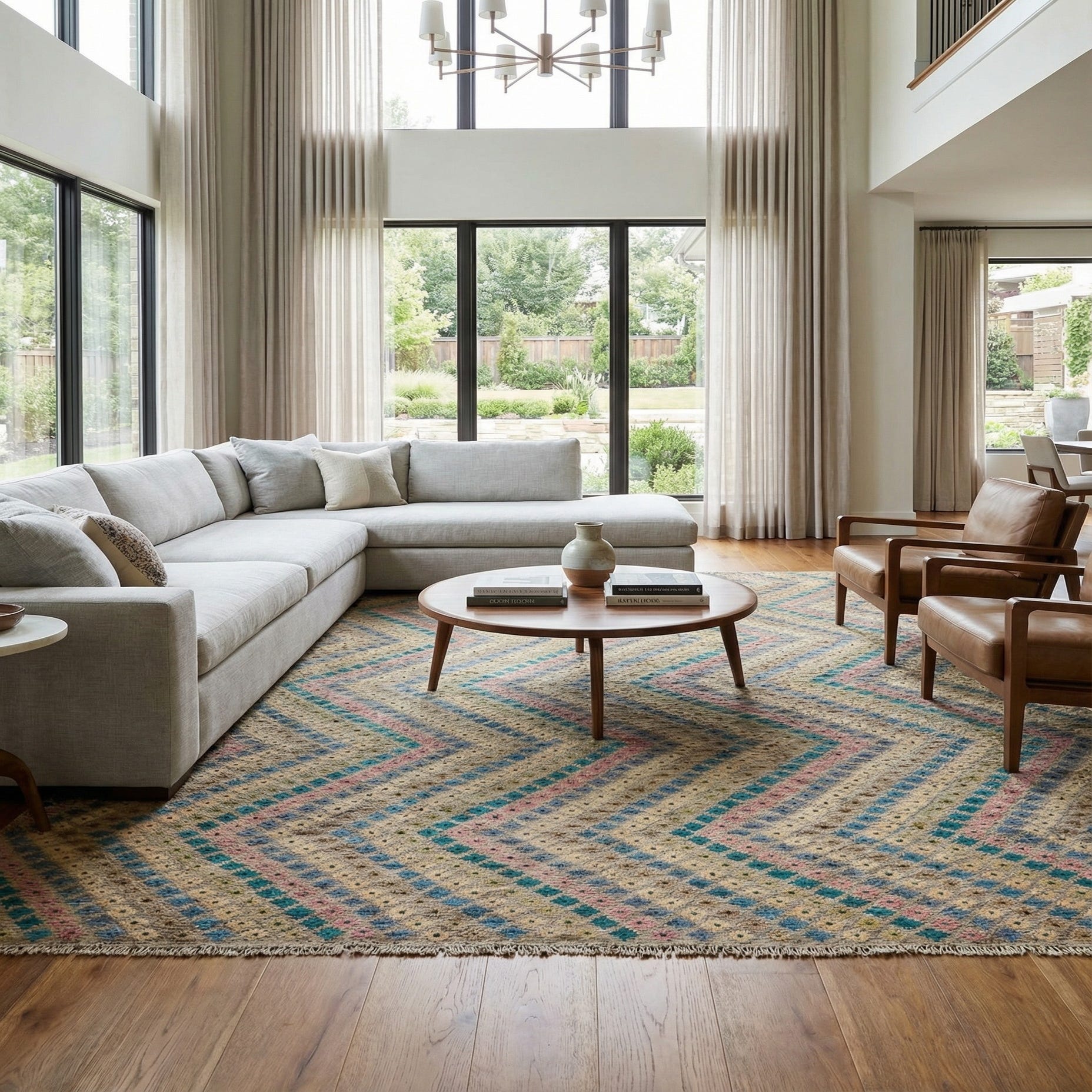 The color mix and pattern work well in casual and contemporary settings: place it under a sofa and coffee table in a sunlit living room to anchor neutral seating and introduce layered color; use it beneath a large dining table to add structure and soft pattern to an open-plan space; or set it in a bedroom with natural wood furniture and crisp linens for a relaxed, collected look. It pairs especially well with mid-century pieces, rattan or leather accents, and painted cabinetry in navy or muted greens.