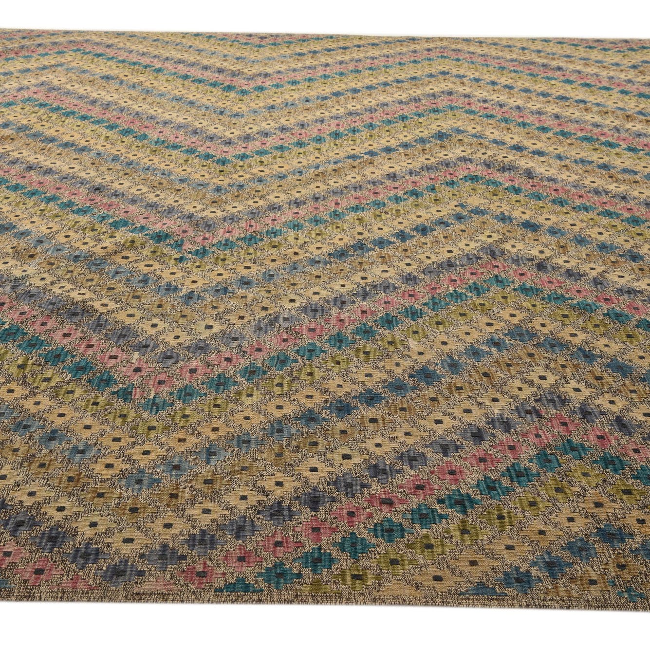 A 10x13 rectangular multi-colored tribal wool rug with a modern chevron pattern, ideal for a living room.