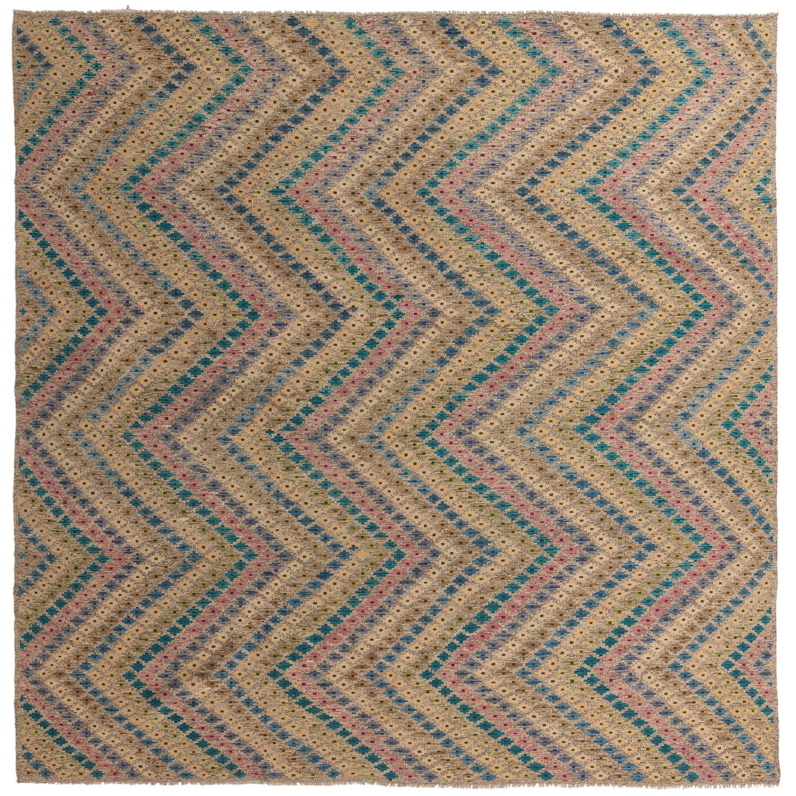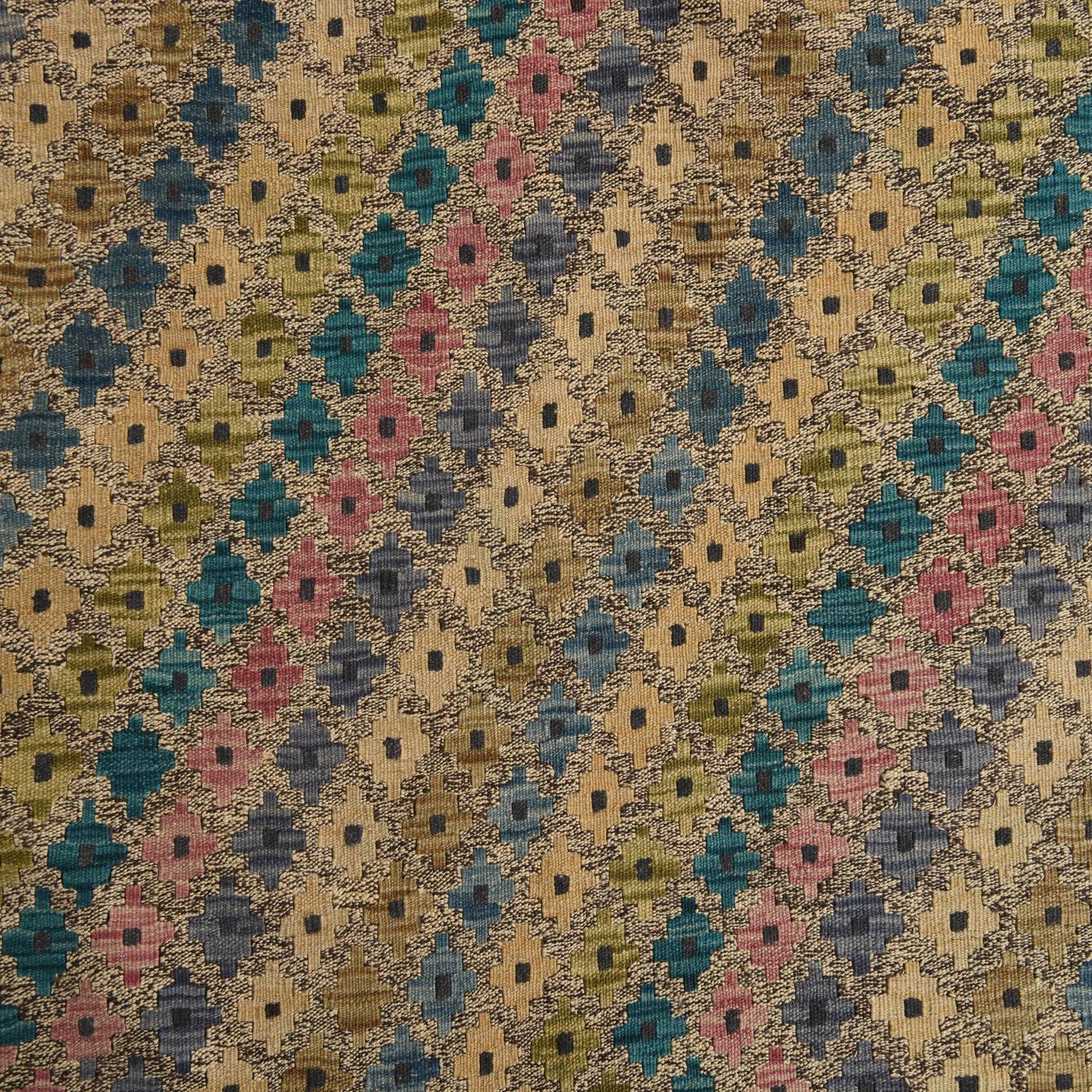 A hand-woven, 100% wool flatweave with a low profile and palpable texture, this rug pairs a disciplined chevron layout with a lively field of tiny geometric motifs. The background is multi-toned, built from a warm beige base enlivened by bands of navy blue, teal, olive, pink, ivory and black. From up close you can feel the subtle irregularities of the weave and see the small diamond-like motifs that form the zigzag stripes, giving the surface both visual movement and a tactile, crafted presence.
