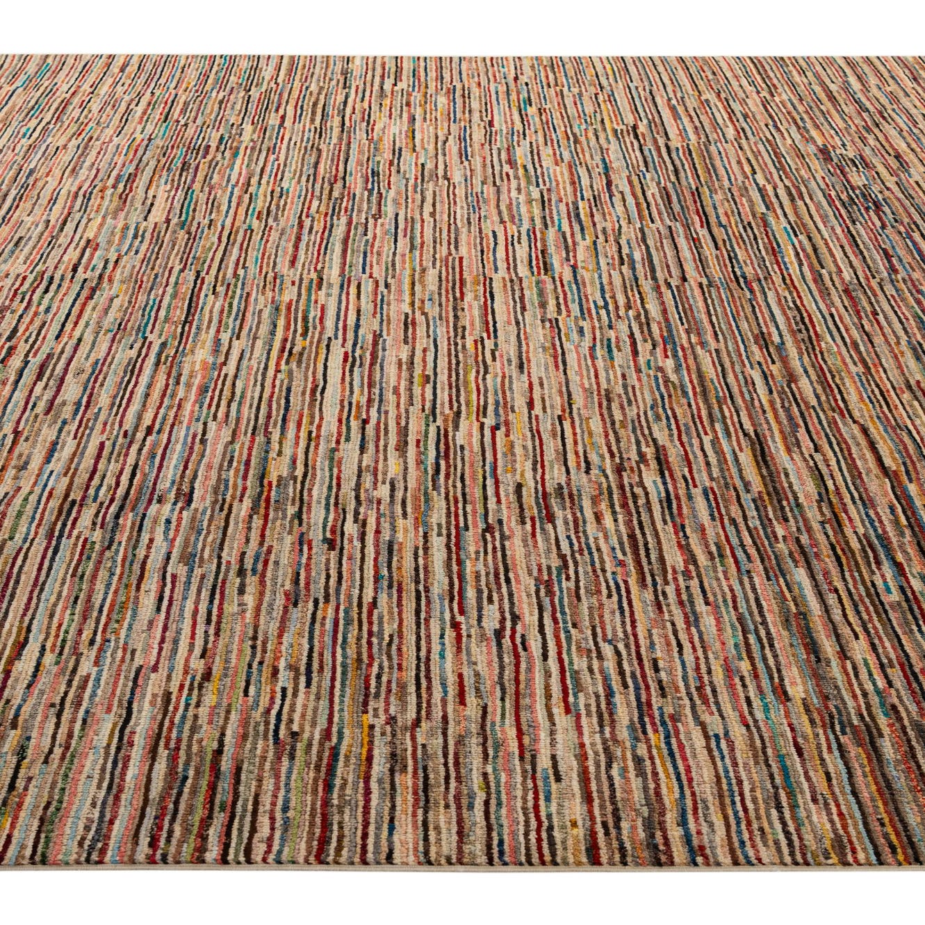 A 10x13 rectangular multi-colored wool area rug with a modern stripe pattern, ideal for a living room.