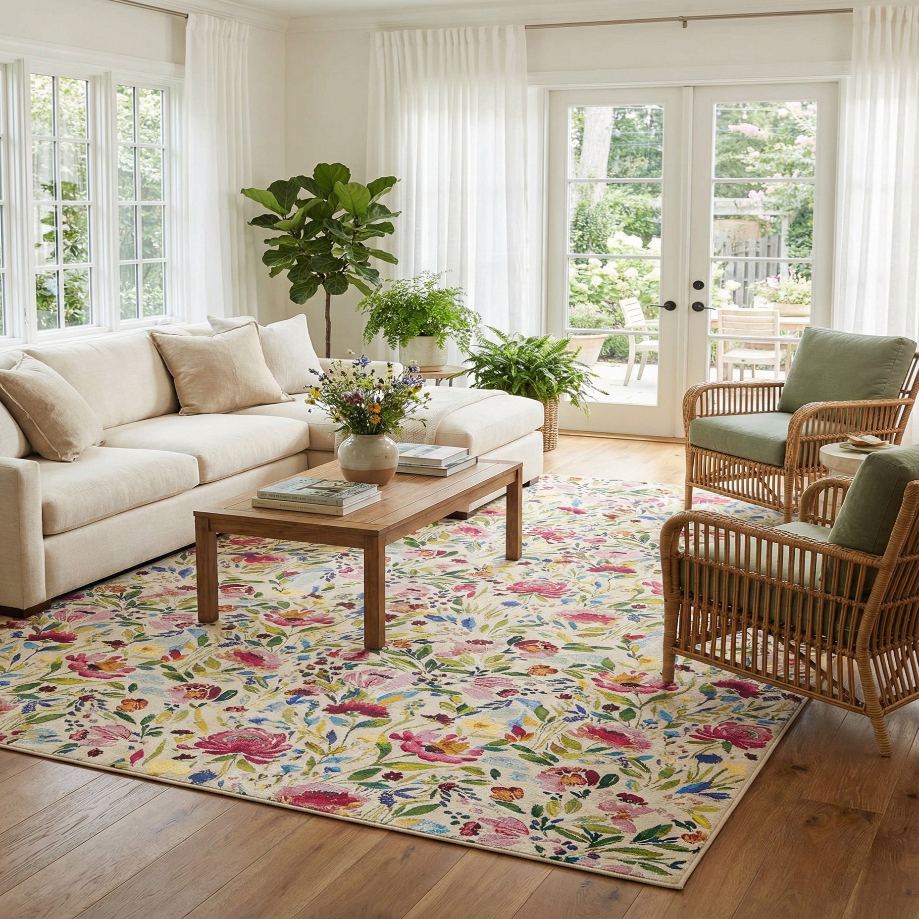 A 10x13 rectangular multi-colored botanical rug with a vibrant floral pattern on a light background, suitable for indoor or outdoor use.
