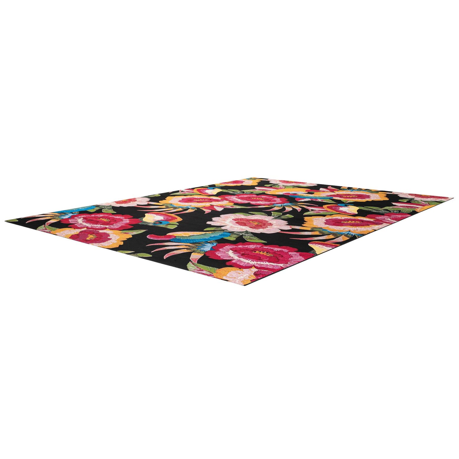 A 10x13 rectangular multi-colored rug with a vibrant modern floral and botanical pattern on a black background, suitable for indoor or outdoor use.