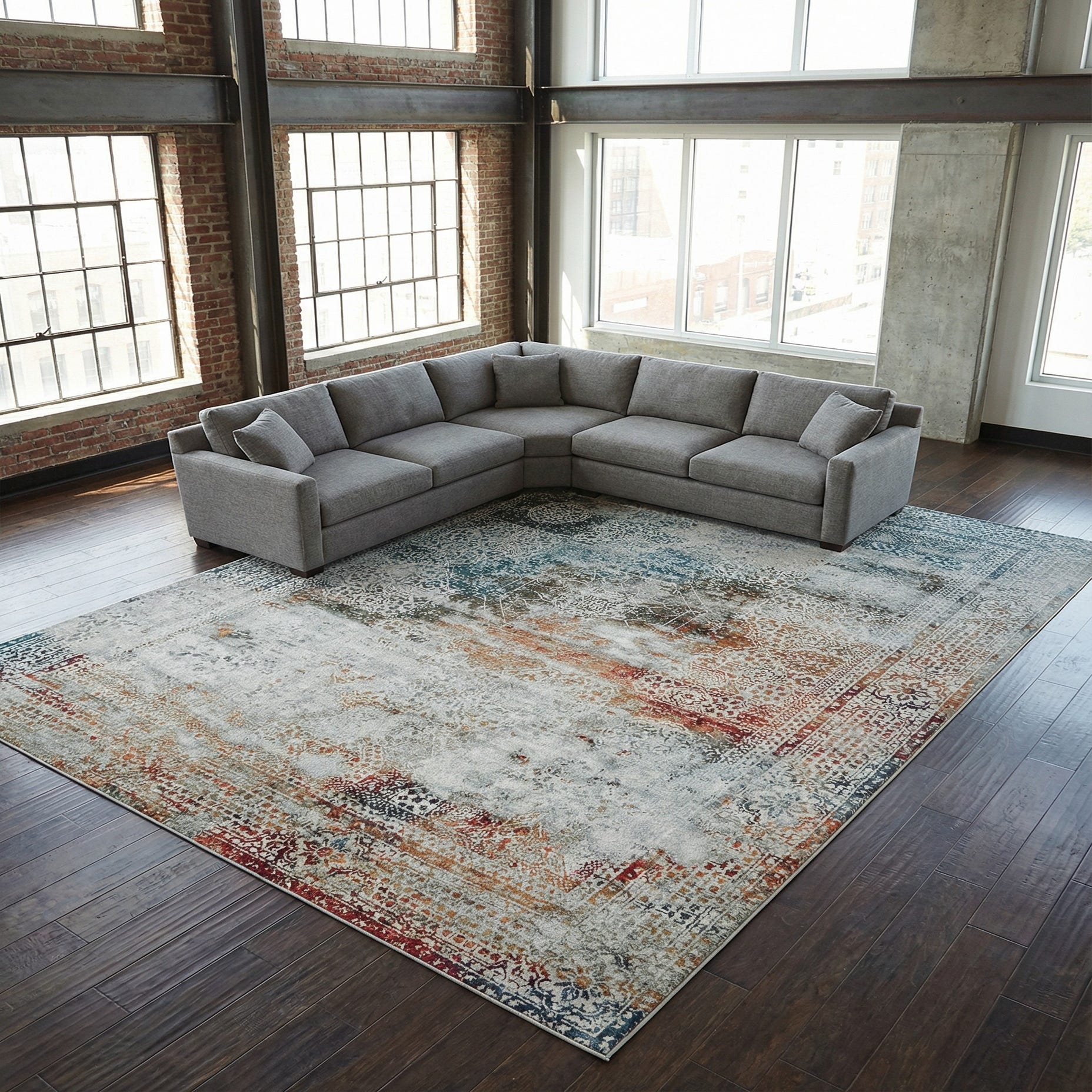 The Santiago Collection offers a 10x13 rug, machine woven of 100% polypropylene, showcasing a vibrant and dynamic array of colors. This rug features a rich tapestry of hues including gray, green, ivory, olive, orange, red, light blue, and blue blended into a multi-colored background. Its intricate pattern is reminiscent of a distressed, vintage aesthetic, rendering both time-honored elegance and contemporary vibrancy.