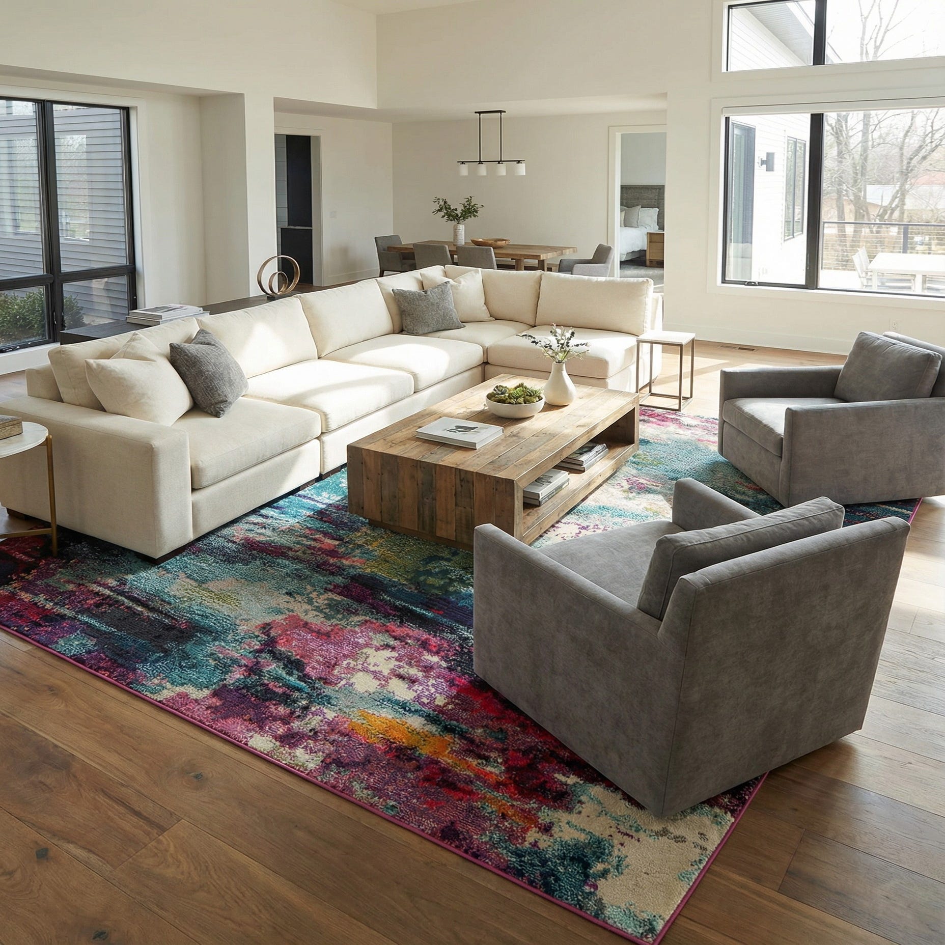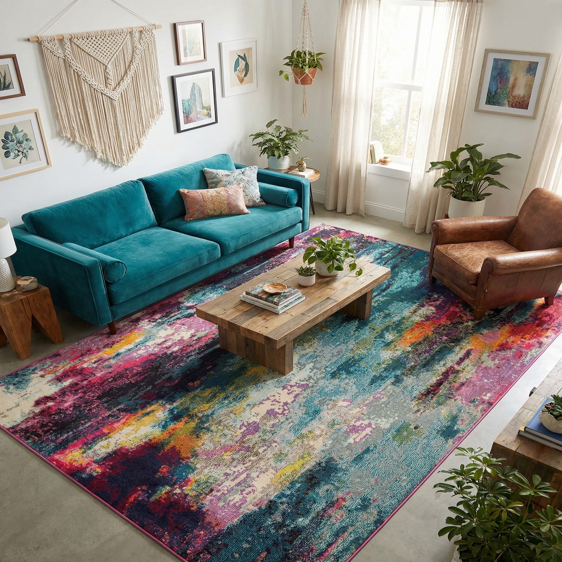 This rug works well as a focal grounding piece in contemporary living rooms or open-plan lofts, bringing energy beneath a simple sofa group or coffee table. It also pairs nicely with mid-century modern and eclectic interiors—place it under a dining table to introduce color or layer it in a bedroom to anchor the bed and bedside seating. In creative studios or modern office settings, the vibrant palette and abstract motif create a lively, gallery-like atmosphere without overwhelming other design elements.