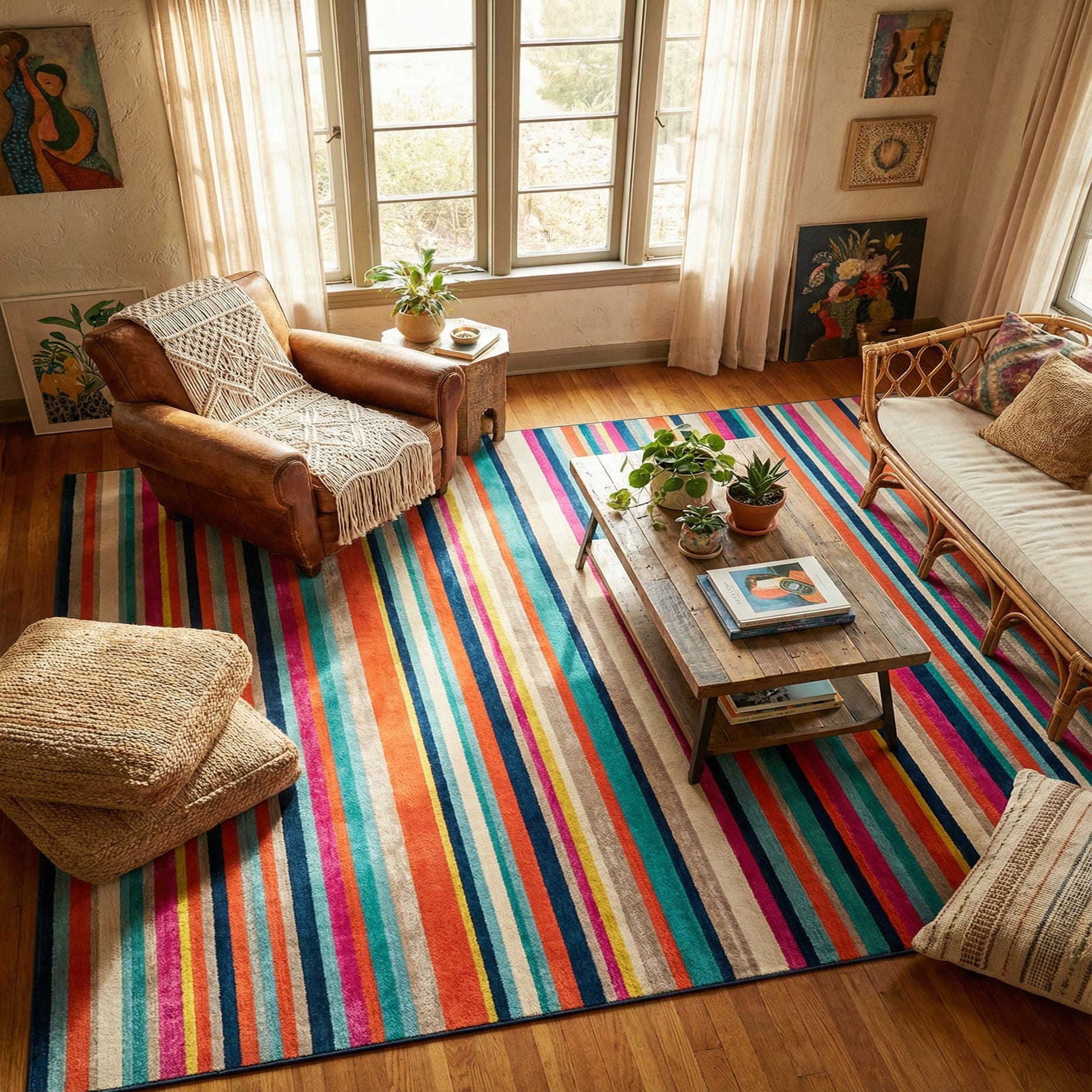 Place this rug to anchor a casual living room or family space, where the colorful pattern complements neutral sofas and natural wood tones. It also works well in a playroom or children's room to introduce color without busy motifs, or under a dining table to add a graphic element to a simple setting. For a layered, eclectic look, pair it with solid cushions and matte metal or navy accents to balance the bright hues.