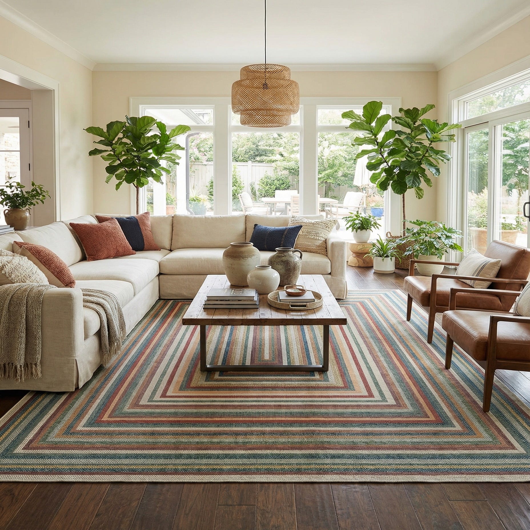 A 10x14 multi-colored rectangular rug with a modern striped pattern, featuring concentric rectangles in various hues.
