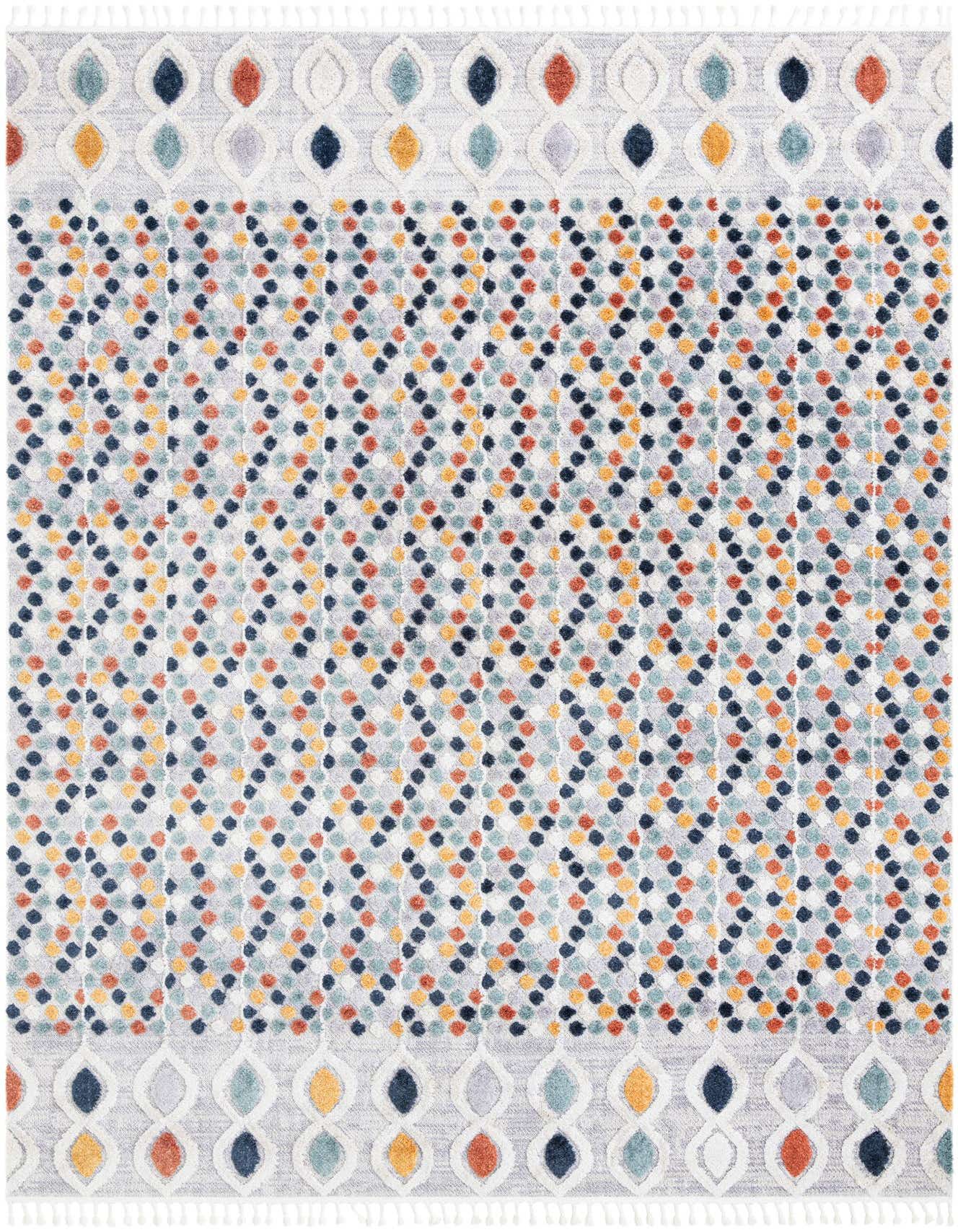 Primary color is Multi. Colors in this rug include: Multi, Gray, Ivory, Navy Blue, Yellow, Green.