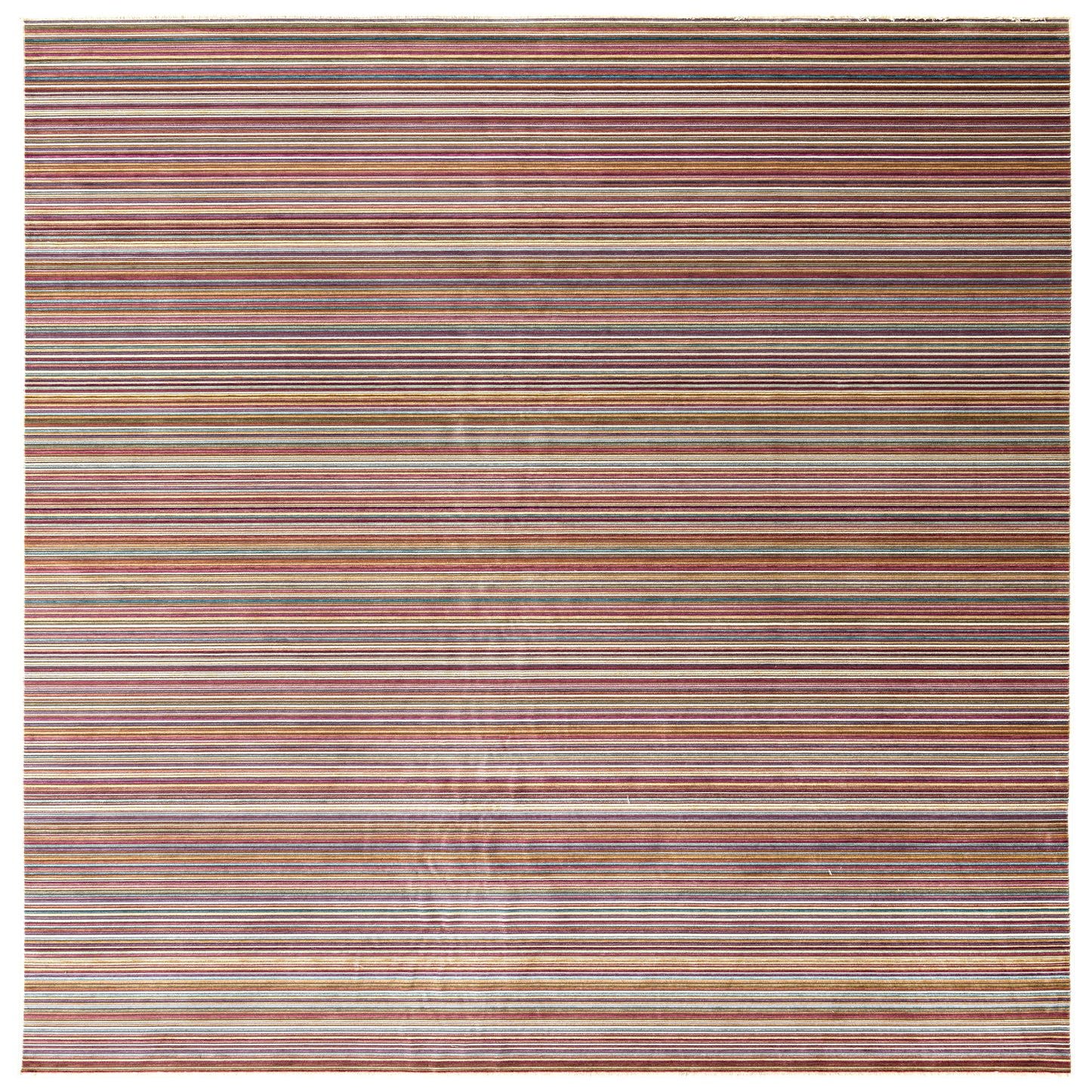 A 10x14 multi-colored striped rectangular area rug with thin horizontal lines in various shades of red, orange, brown, blue, and white.