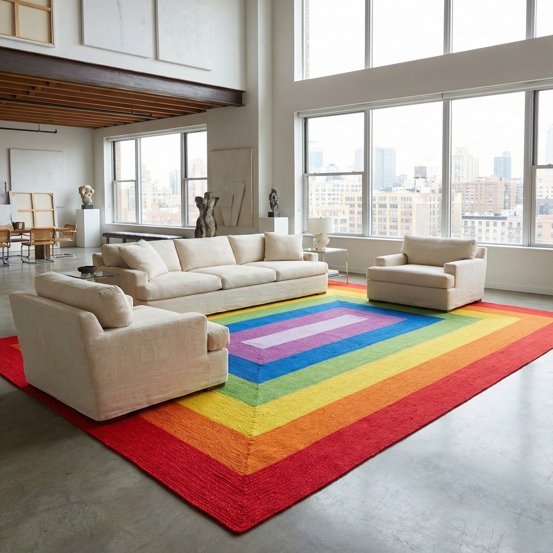 A 10x14 rectangular multi-colored wool area rug featuring a vibrant rainbow concentric rectangle pattern.