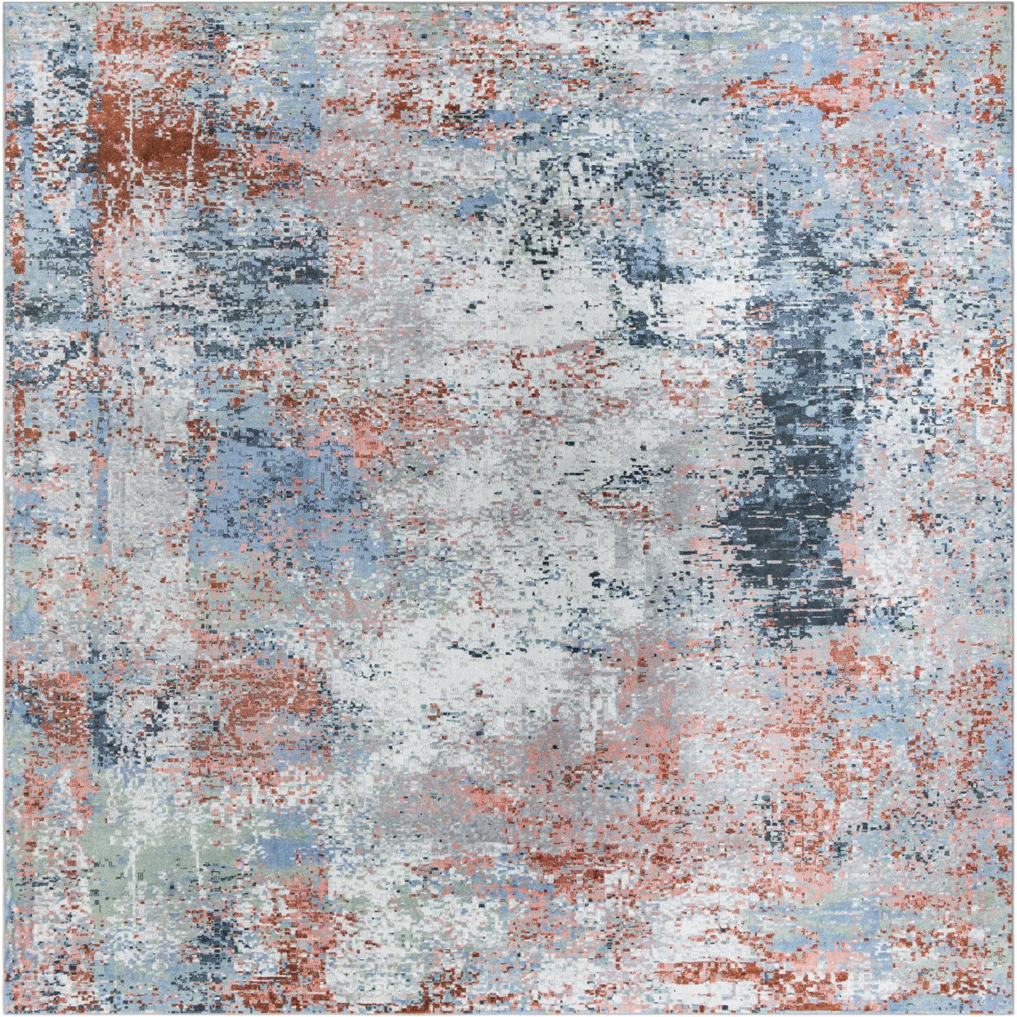 A 10x14 rectangular multi-colored modern abstract rug featuring shades of blue, rust, and white, suitable for a living room.