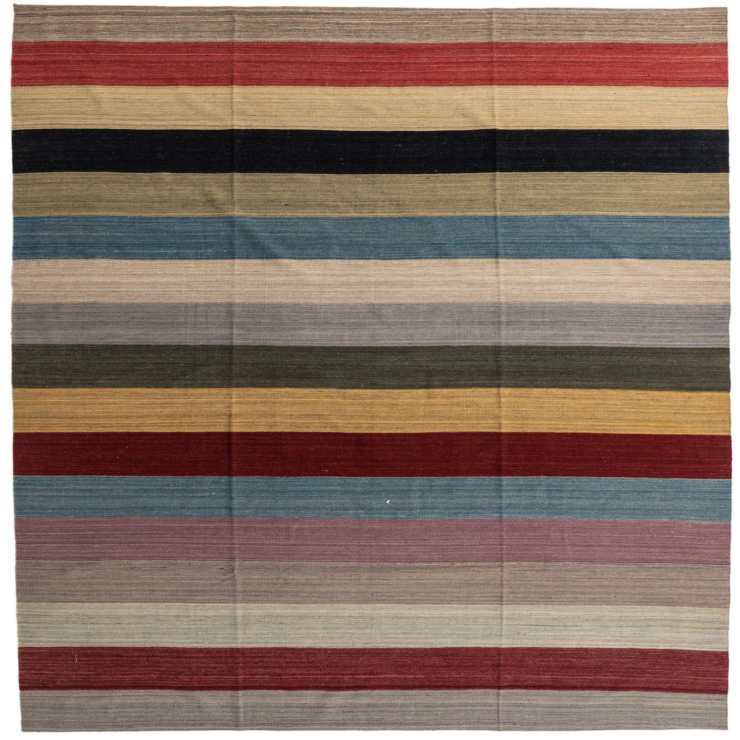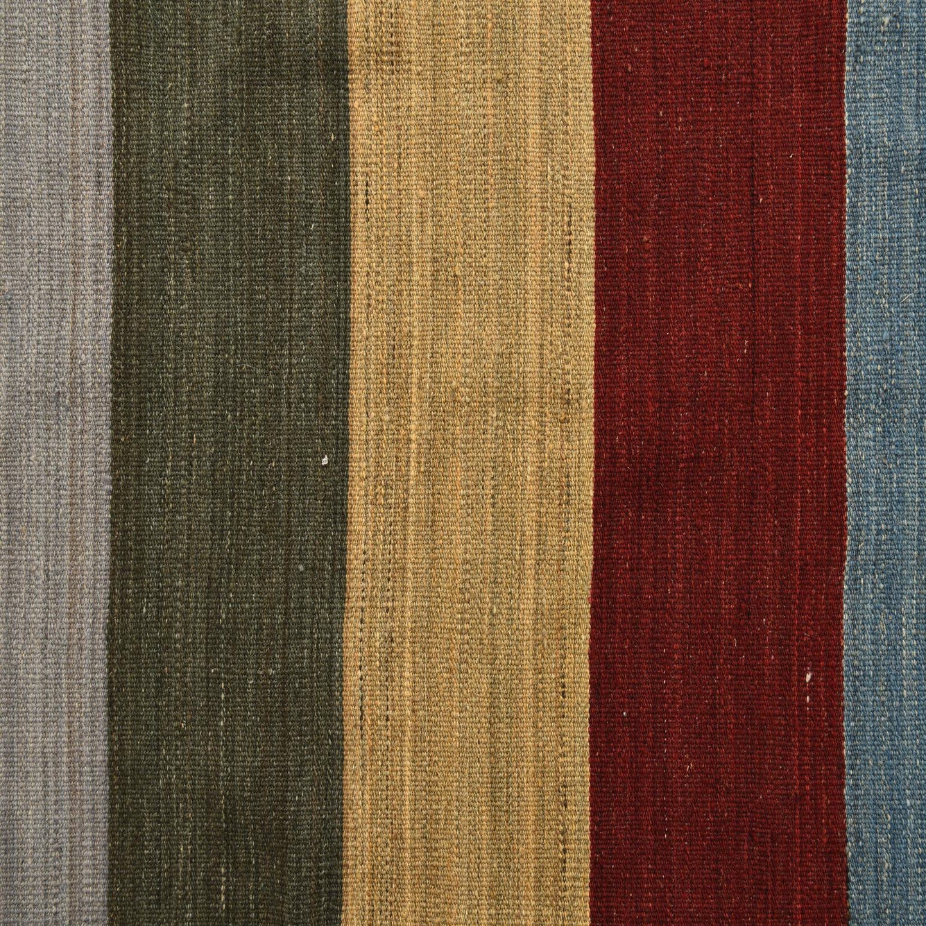 A 10x14 rectangular multi-colored flatweave wool rug with horizontal stripes in various shades, including red, blue, beige, black, and green.