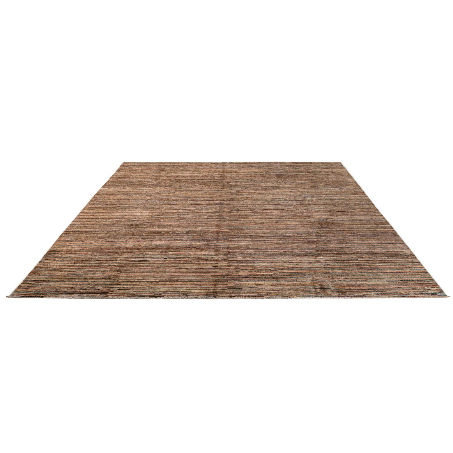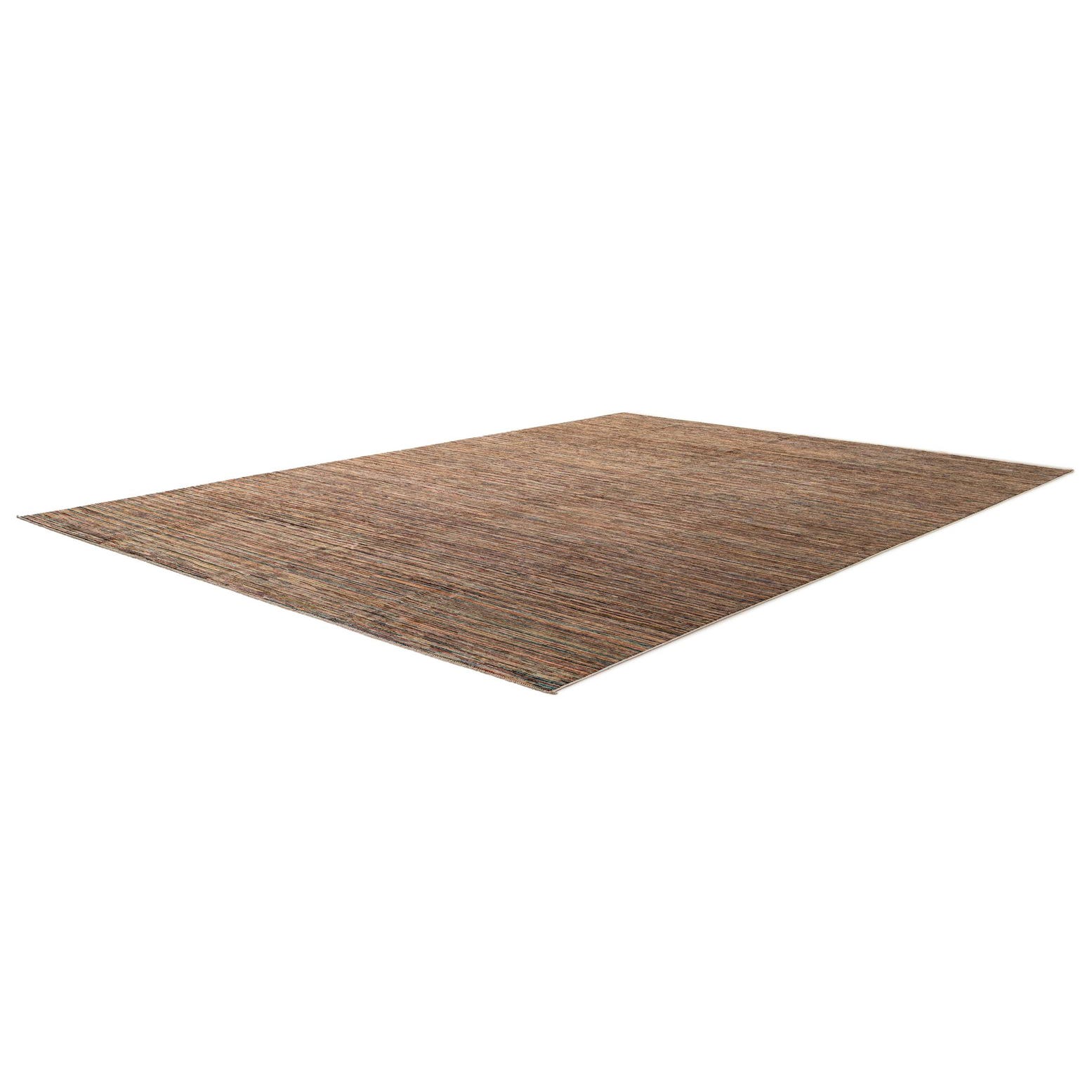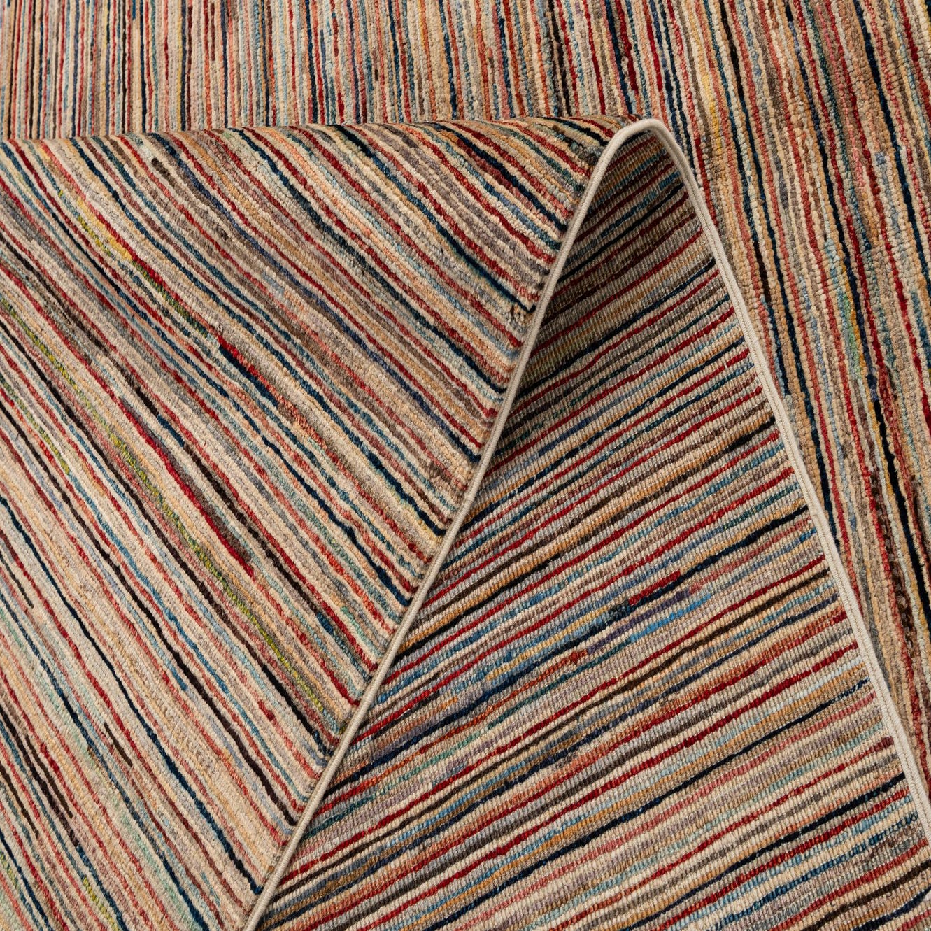 A 10x14 rectangular multi-colored modern stripe wool rug with a flat pile, suitable for indoor use.