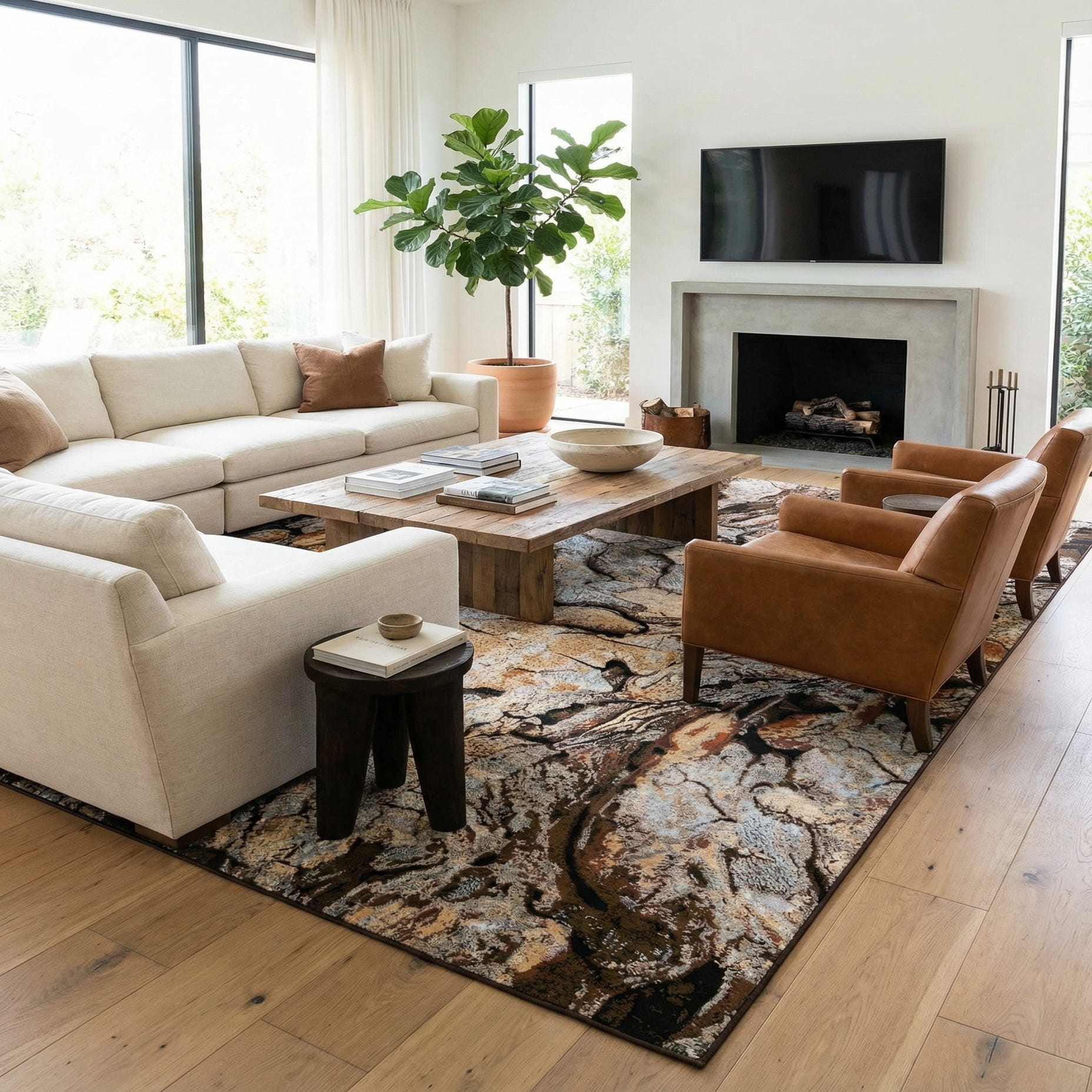 Place this rug where its earthy palette can anchor a room: beneath a wood dining table to warm a modern farmhouse dining area, in a covered patio or sunroom to complement rattan and metal furnishings, or in a contemporary living room with neutral upholstery and black metal accents to pull the space together. Its large-scale motif also works well in open-plan lofts or nature-inspired interiors where layered textures and muted color play are central to the design.