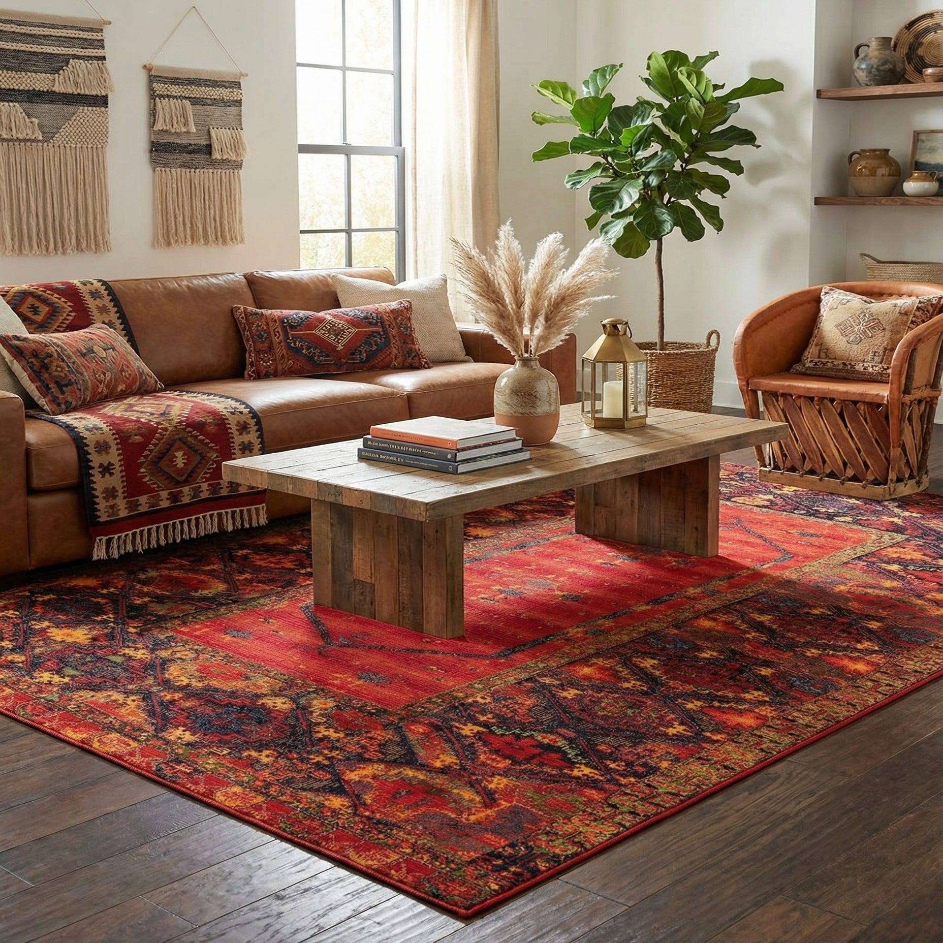 Machine-made polypropylene construction makes this piece appropriate for high-traffic areas and outdoor-ready settings while keeping maintenance straightforward. It pairs naturally with warm-wood furnishings, leather seating and rattan—ideal for a transitional living room, a covered patio or a sunroom with a collected, global aesthetic. Use it to anchor a seating group, add contrast beneath a light-colored sofa, or layer with natural-fiber mats and textured pillows for a relaxed, curated look.