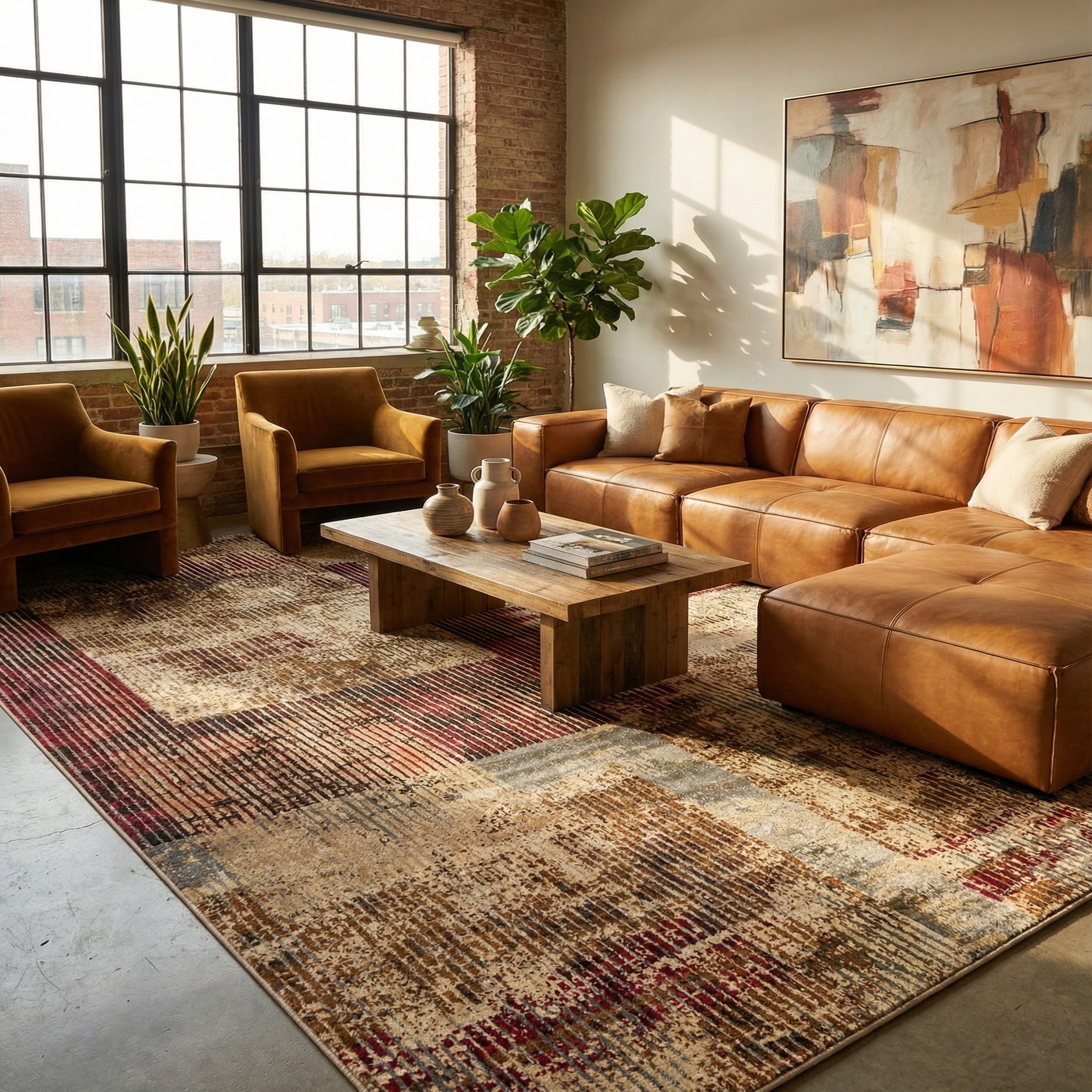 Machine-made of polypropylene, the pile is low and dense with a soft, slightly textured hand that is comfortable underfoot while holding its shape. It pairs well with warm wood tones and leather furniture for a contemporary living room, anchors a seating group in a transitional family room, or adds color and structure beneath a dining table or home office setup. Use charcoal or navy textiles and brass or matte-black metal accents to echo the rug’s cooler notes, or bring out its warm hues with rust and beige accessories.