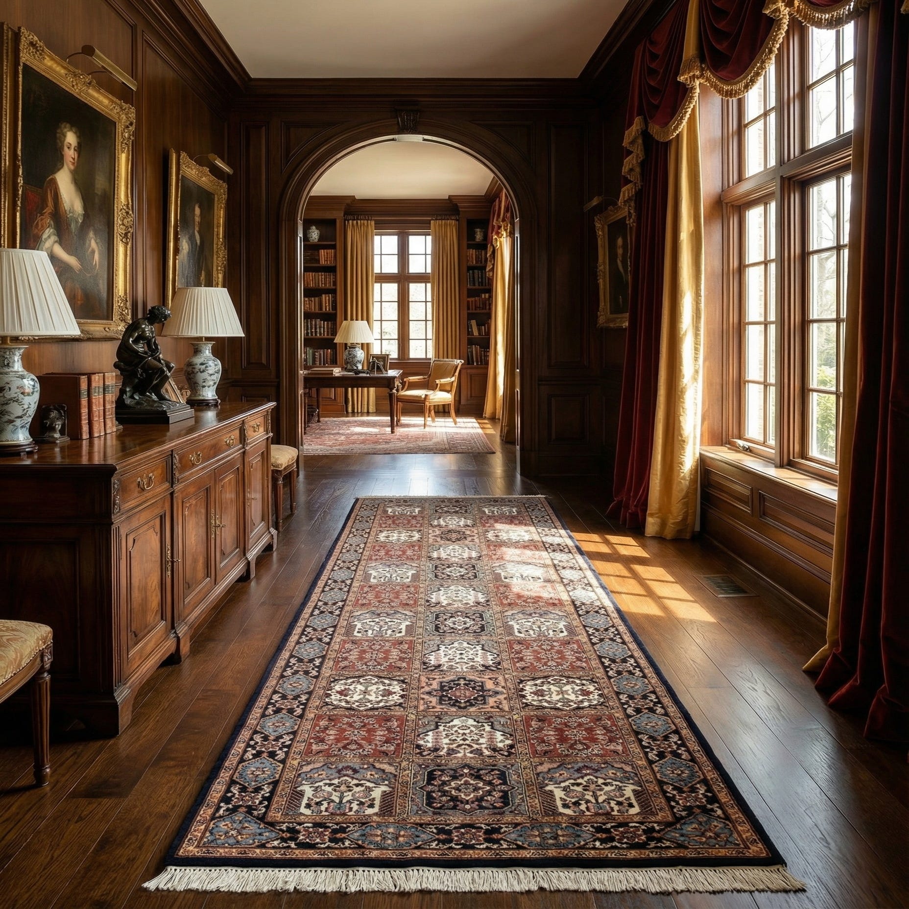 A multi-colored 11 ft runner rug with a traditional tribal pattern featuring various floral motifs in squares, ideal for a hallway.