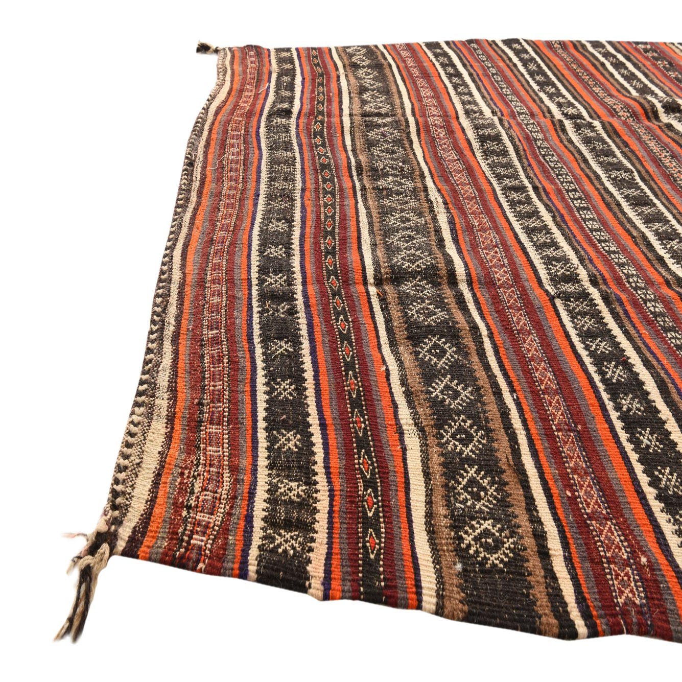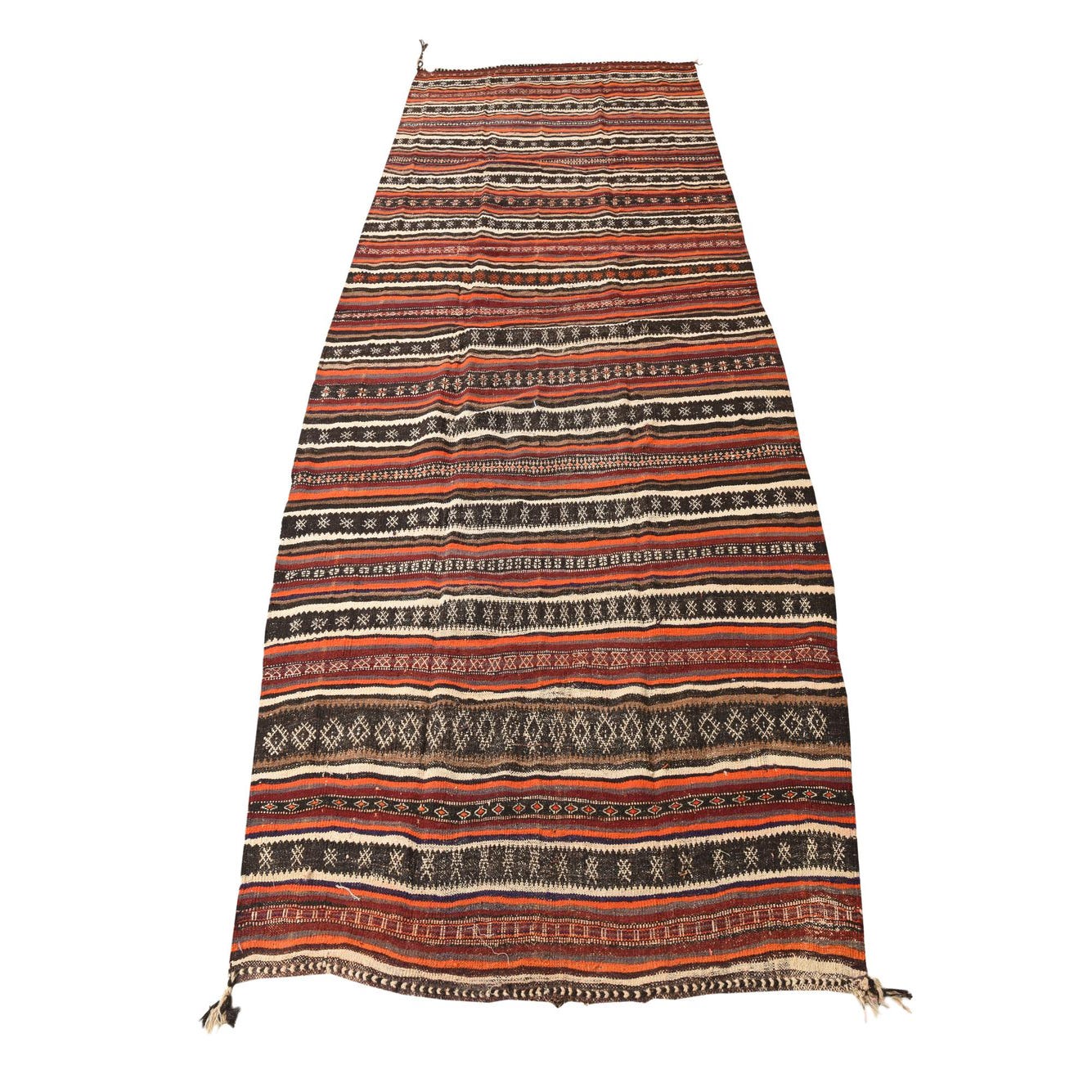 Hand-woven of 100% wool, this kilim runner has a flatweave construction with a firm, low-profile texture that feels sturdy underfoot. The design is composed of repeating horizontal bands — small-scale diamonds, crosses and linear motifs — interspersed with narrow stripes. Warm tones of burgundy, orange and brown are balanced by ivory and beige, with black details for contrast; the background color is multi, giving the pattern a layered, woven appearance.