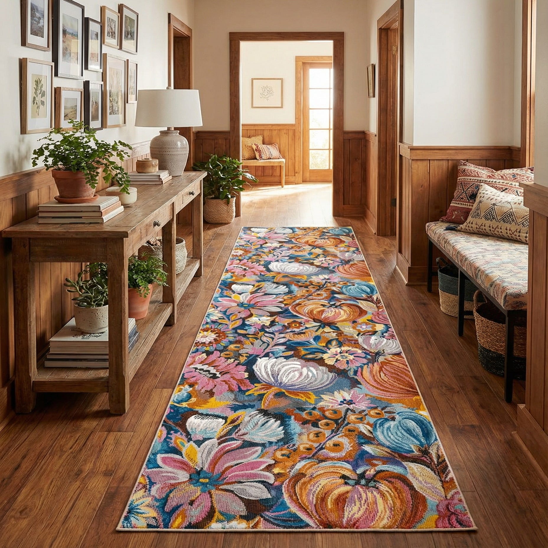 This runner brings color and pattern to narrow spaces—try it in a hallway or entry to create a striking approach, along a kitchen galley for a burst of pattern beneath cabinetry, or beside a bed to add warmth and visual interest. It pairs well with warm wood floors or painted cabinetry, deep blue or neutral-gray upholstery, and layered textiles in complementary pinks or ochres for an eclectic, modern-bohemian, or updated traditional look.