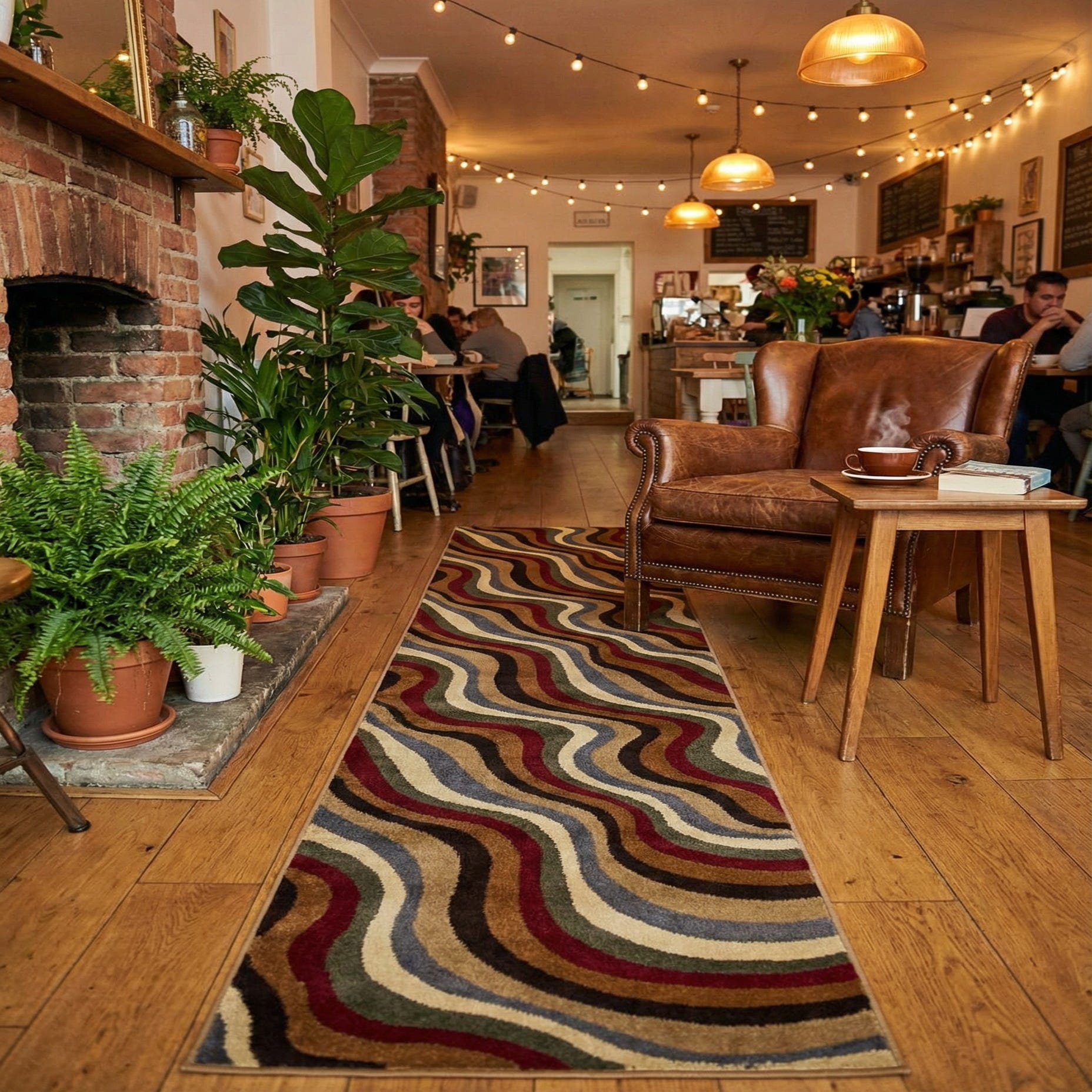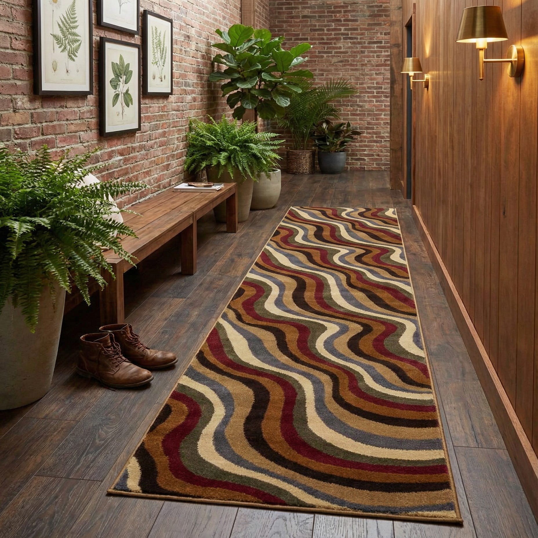 Place this runner in a long hallway or narrow entryway, alongside a kitchen island, or layered in front of a sofa or bed to introduce movement and warmth. The warm tones pair naturally with honey- or walnut-stained wood, leather seating and matte metal accents; it also complements neutral walls and textured linens for a casual, modern look.