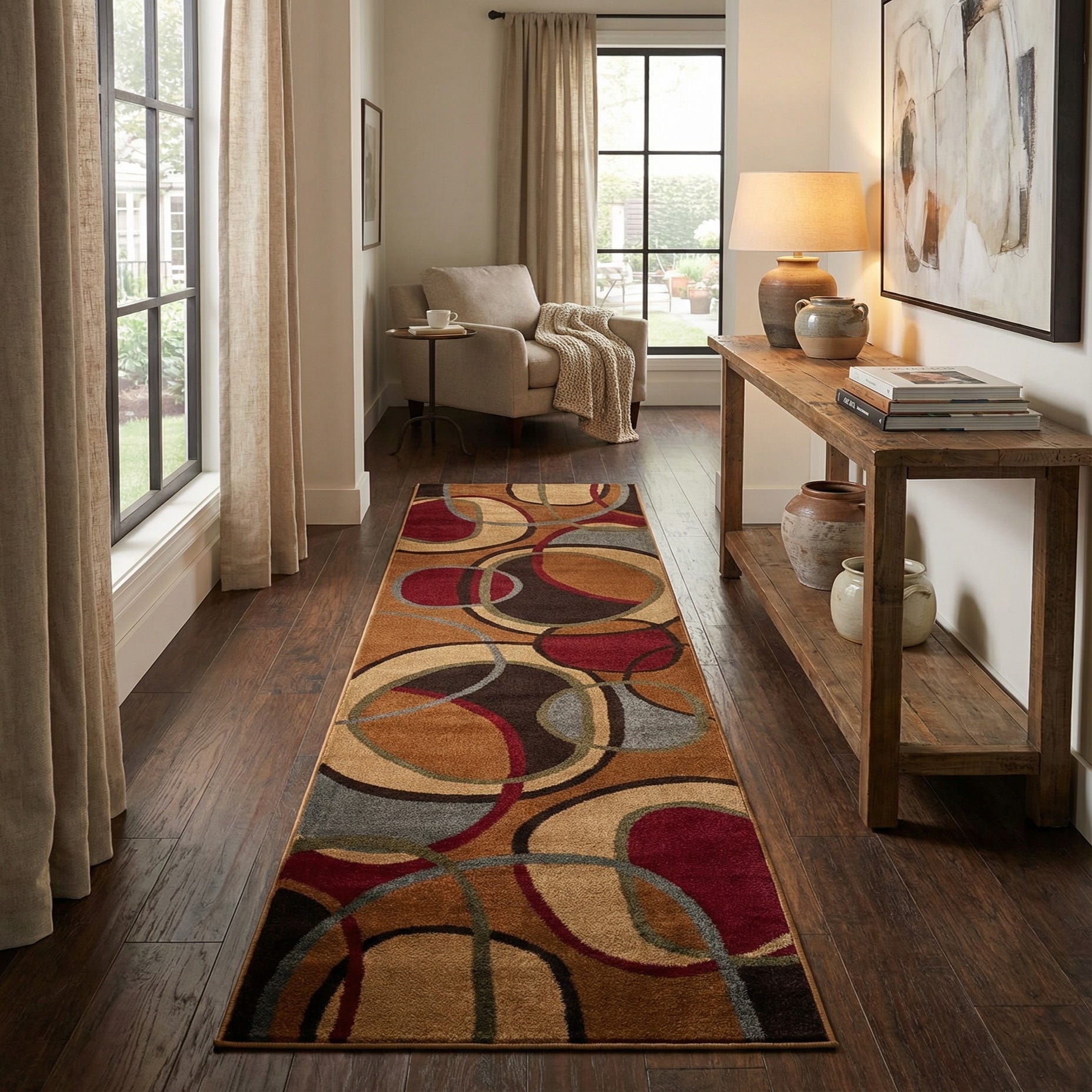 A modern abstract runner with a lively arrangement of overlapping ovals and sweeping arcs, this rug layers warm neutrals and bold accents across a multi background. Rich burgundy and deep brown shapes sit alongside beige, light brown and gray contours, creating a rhythmic, contemporary pattern that reads as both graphic and approachable. The defined lines and rounded forms give the design a sense of movement while the mixed color field keeps the overall look grounded.