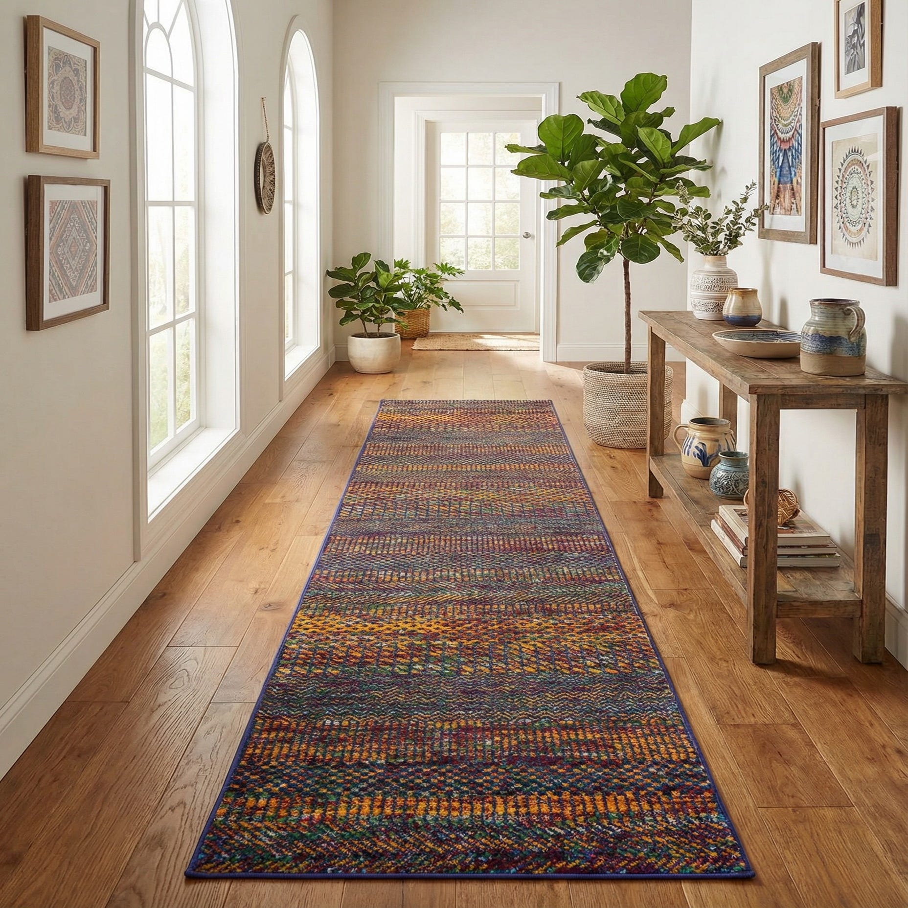 Ideal for a long entryway, hallway or narrow kitchen aisle, this runner brings color and movement to transitional spaces while standing up to everyday use. Pair it with warm wood floors and neutral furniture to let the pattern take center stage, or use it to add a playful contrast in modern-bohemian or eclectic rooms. It also works well layered in contemporary interiors—balance the bold pattern with simple, solid textiles and matte metal or natural-finish accents for a cohesive look.