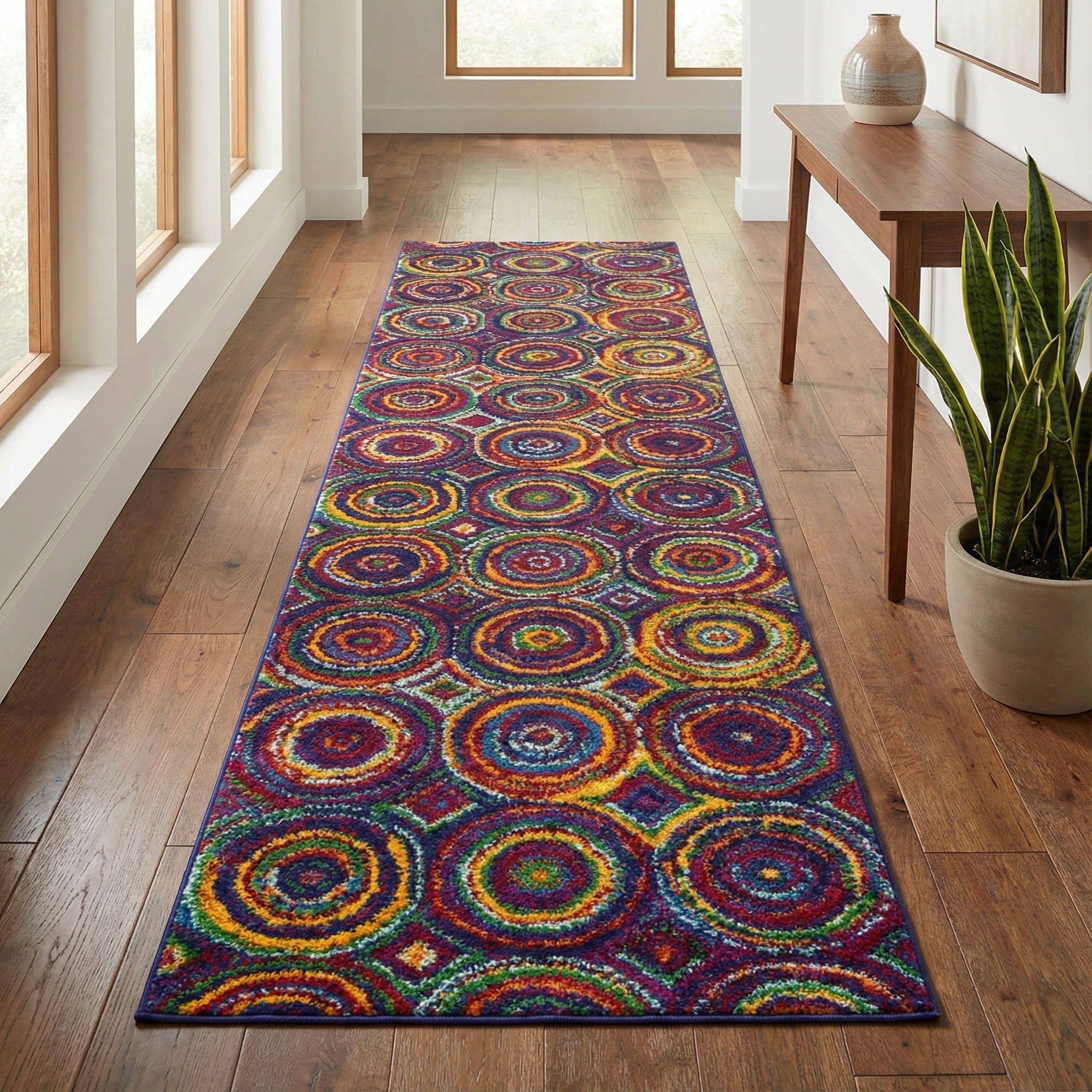This runner works well in narrow or transitional spaces where you want to add color and movement—place it in a hallway or entry to guide the eye, or lay it along the side of a bed to bring warmth and personality to a bedroom. It also pairs nicely with contemporary furnishings or eclectic decor: use neutral upholstery to let the rug take center stage, or mix it with bold accent pieces for a curated, layered look. The lively palette makes it a good option for creative spaces like a home office or playroom where color and texture energize the room.
