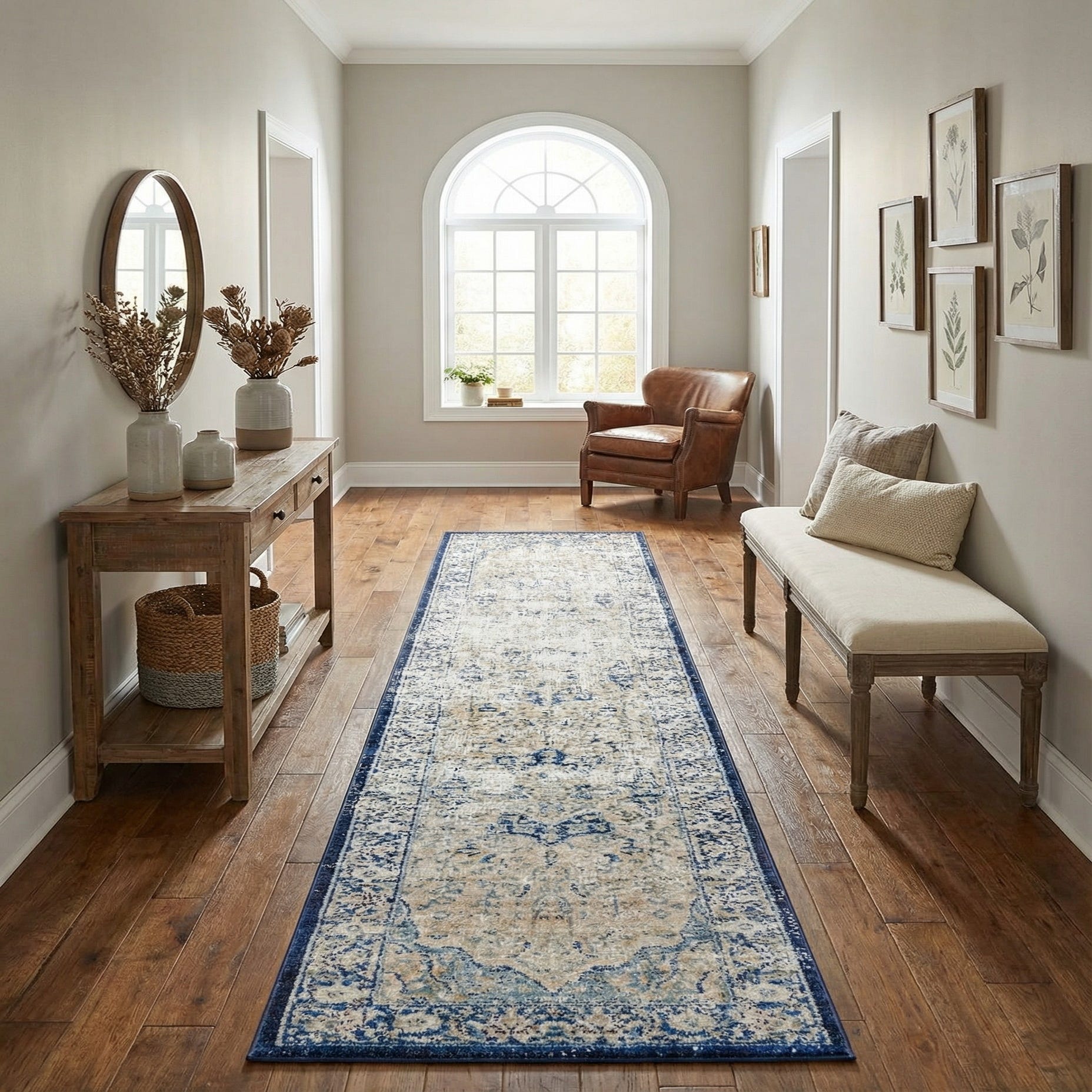 Primary color is Multi. Colors in this rug include: Multi, Ivory, Beige, Blue, Light Blue, Navy Blue.