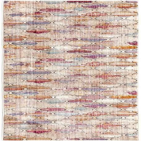 The Deepa Collection 12 Ft Runner is a machine-woven rug crafted from 100% polyester, ensuring durability and a soft tactile experience underfoot. This runner features a dynamic pattern that echoes traditional motifs with a modern interpretation, presenting in a multi-colored palette that includes beige, blue, orange, and pink on a multi-hued background. The design boasts a distressed look, giving it a well-loved and vintage aesthetic.