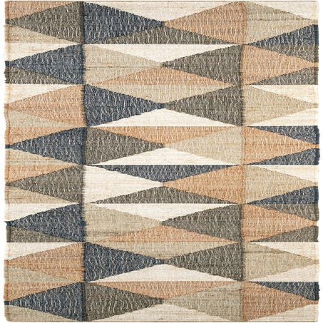 A 12 ft runner rug with a modern geometric pattern in multi-colored jute and cotton, ideal for a hallway.