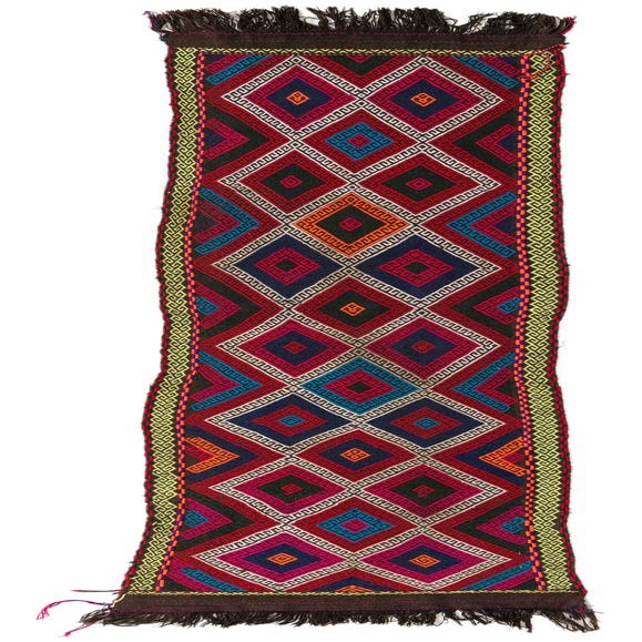 A vibrant 12 ft Kilim Fars runner rug with a multi-colored geometric diamond pattern and fringed ends, ideal for hallways.