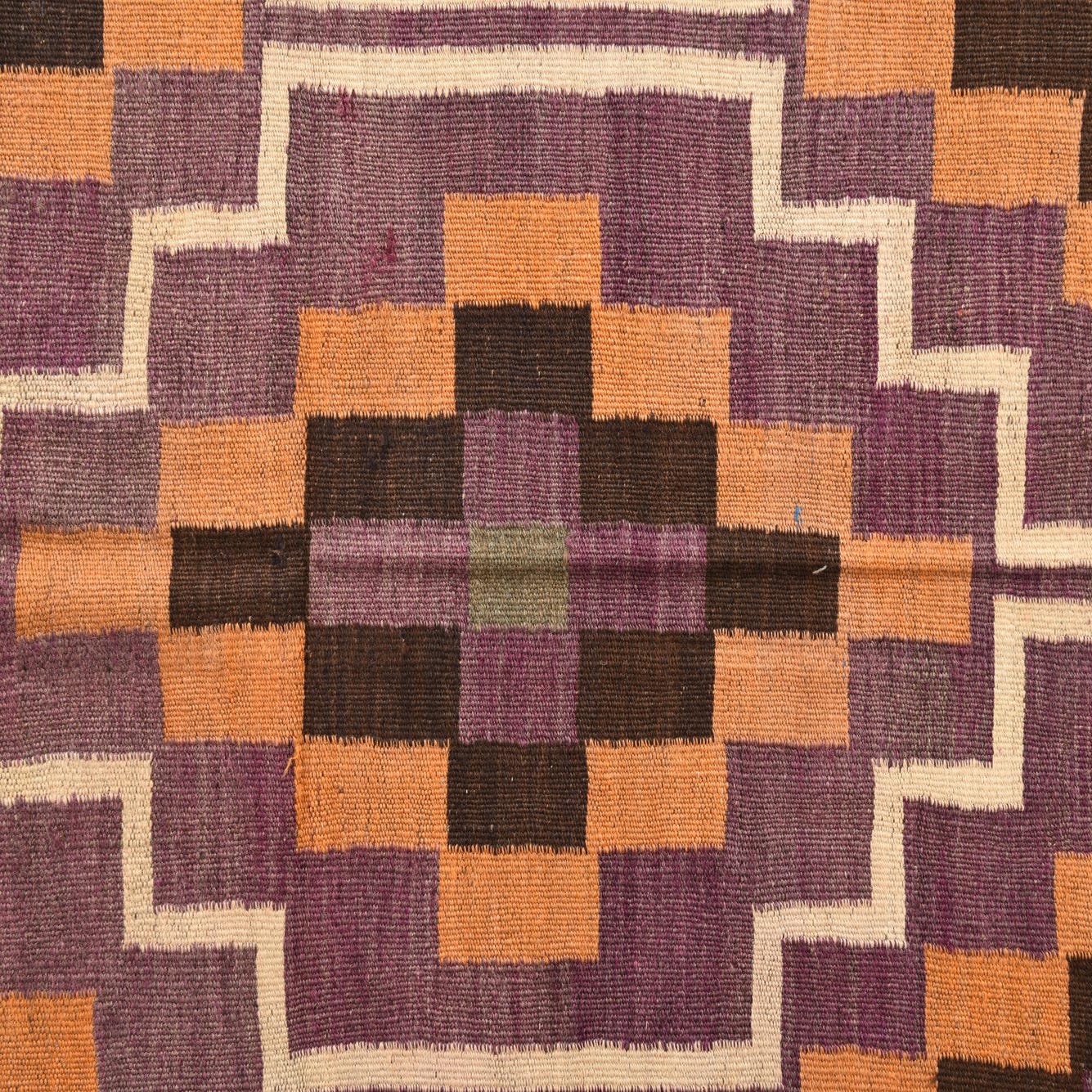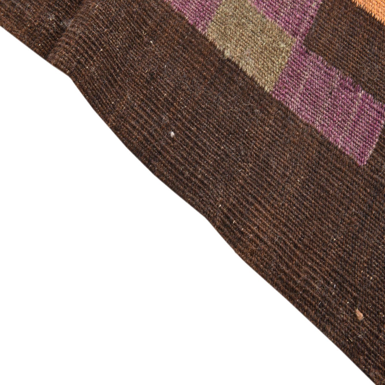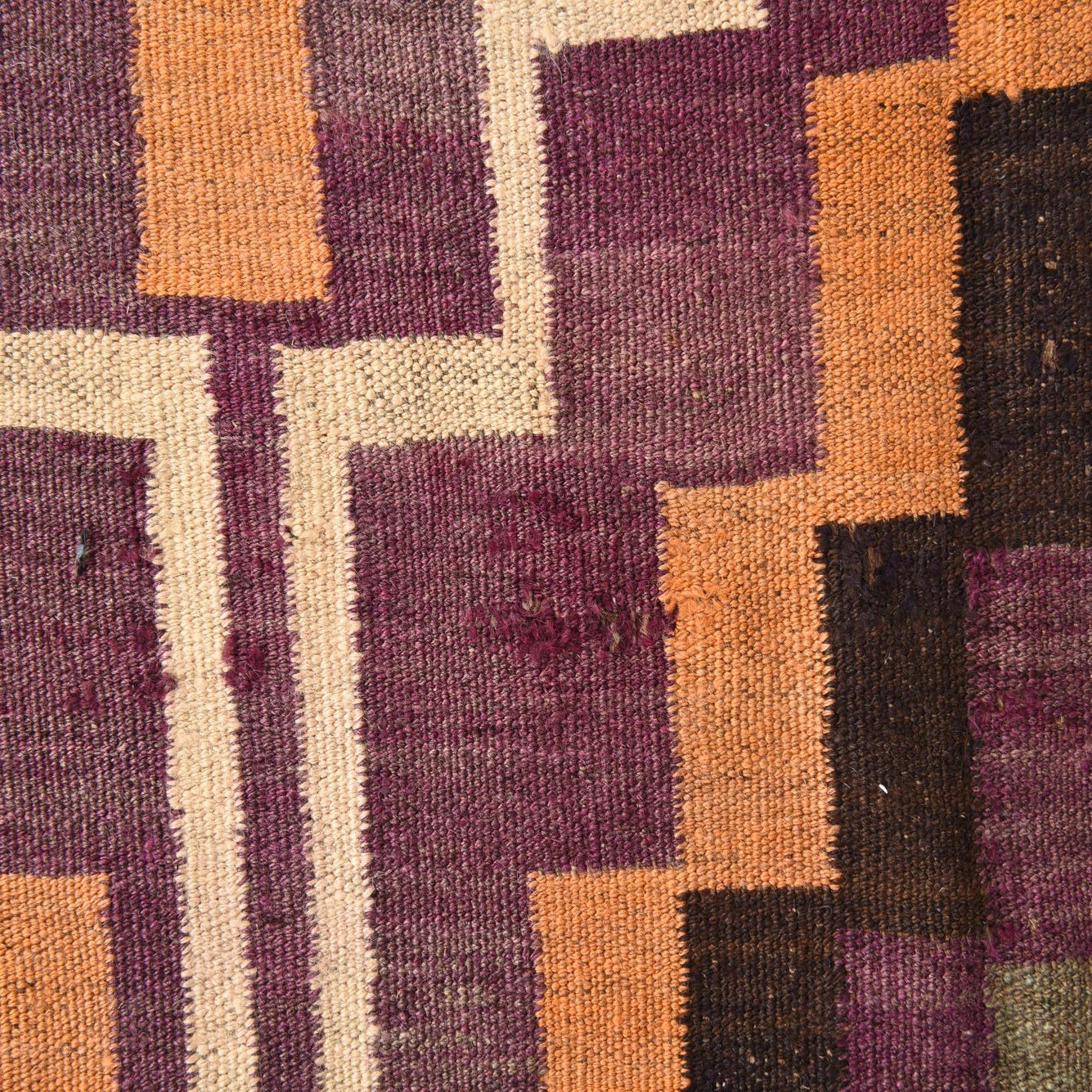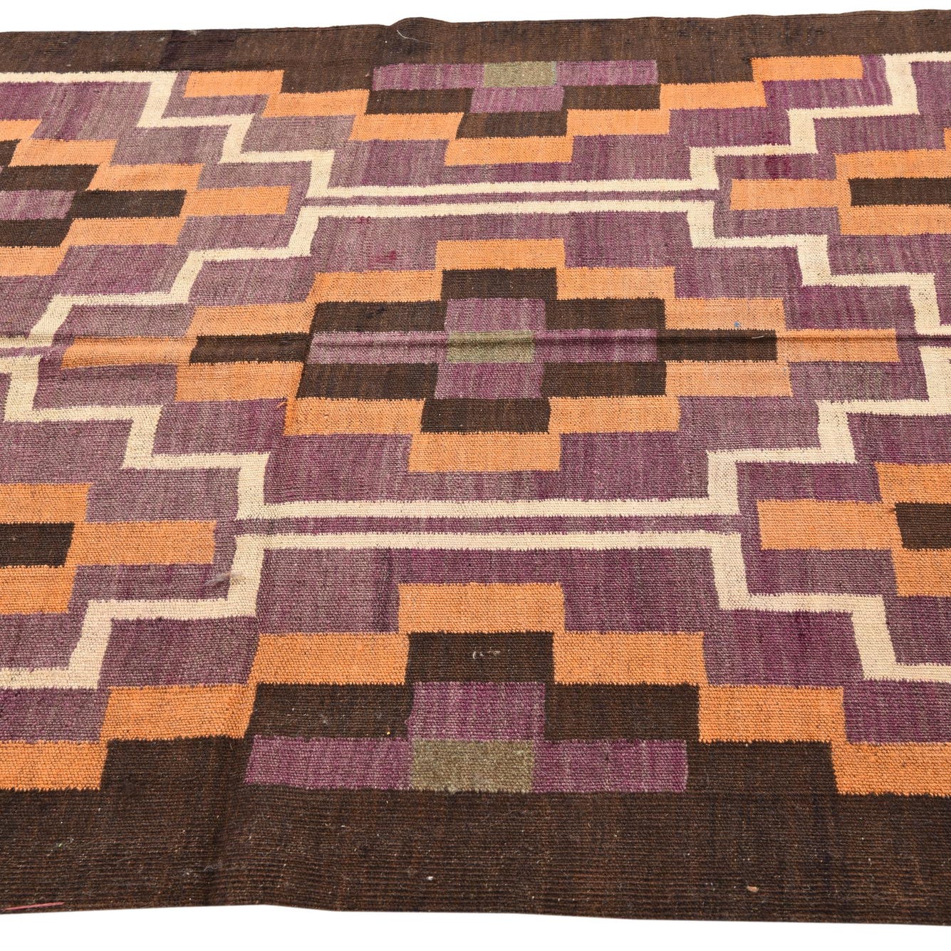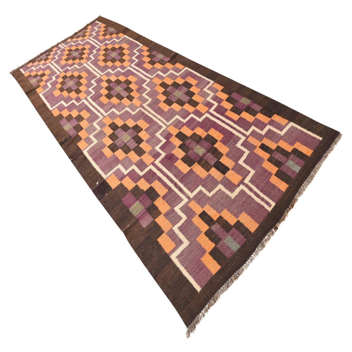 A 12 Ft Kilim Fars runner rug with a multi-colored geometric pattern in purple, orange, brown, and cream, ideal for a hallway.