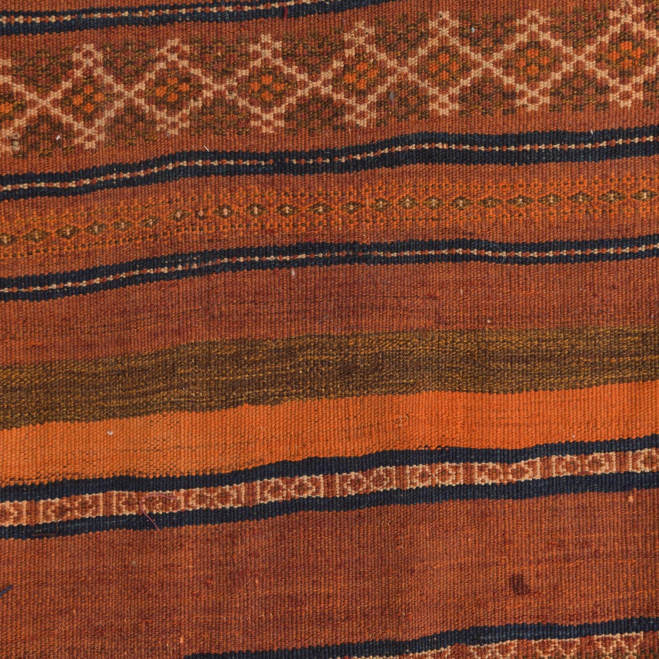 This hand-woven, 100% wool kilim runner presents a series of narrow horizontal bands and small geometric motifs that give the piece a lively, textural rhythm. The background is multi-tonal with warm brown and orange fields layered with thin navy blue and ivory stripes; two ivory-bordered vertical panels run near each edge, adding a subtle frame to the pattern. The flatweave construction feels firm and slightly textured underfoot, with low pile and a tight, tactile weave that highlights the woven color transitions and the short fringed ends.