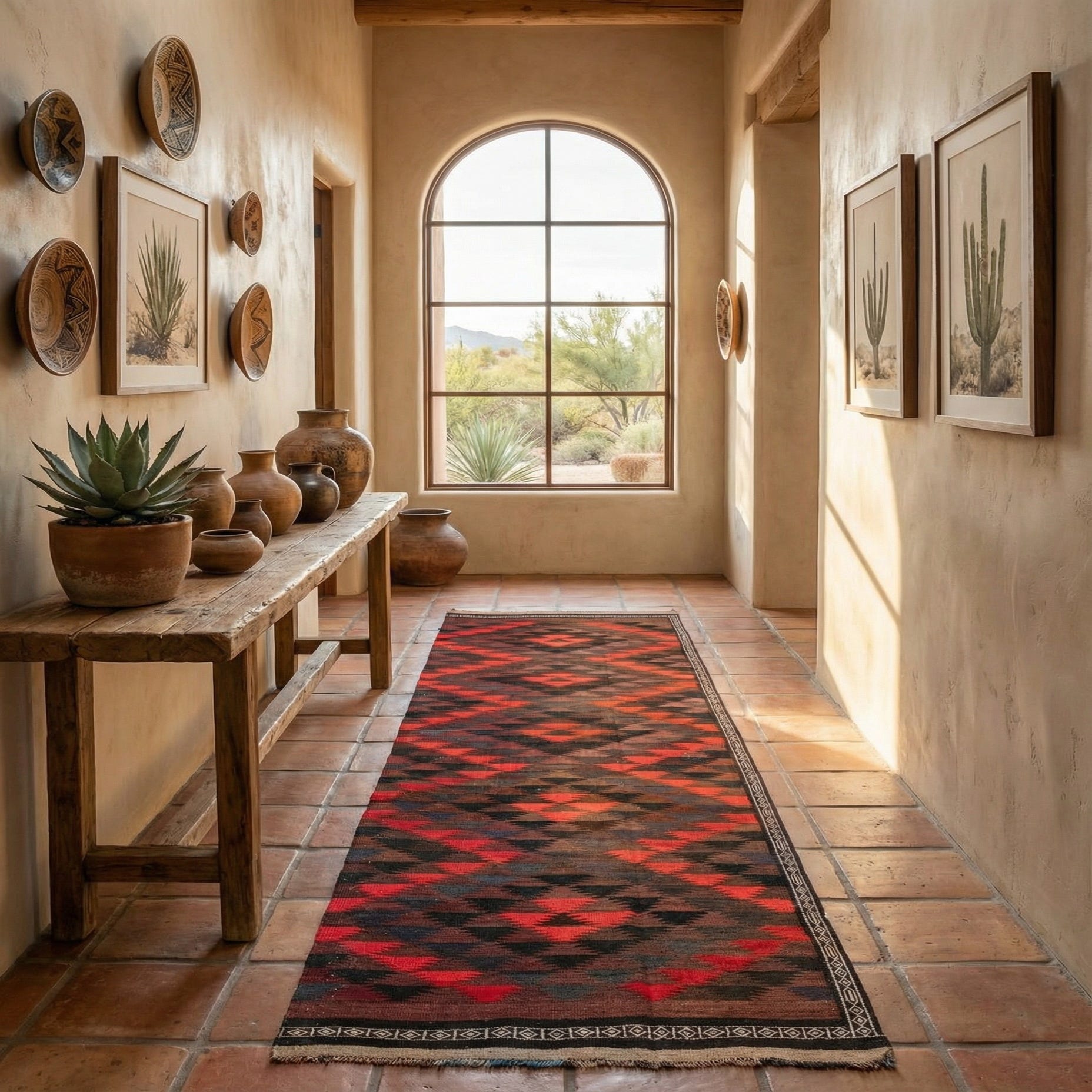 A 12 ft runner rug with a vibrant multi-colored tribal pattern featuring red, black, and brown geometric shapes, ideal for a hallway.